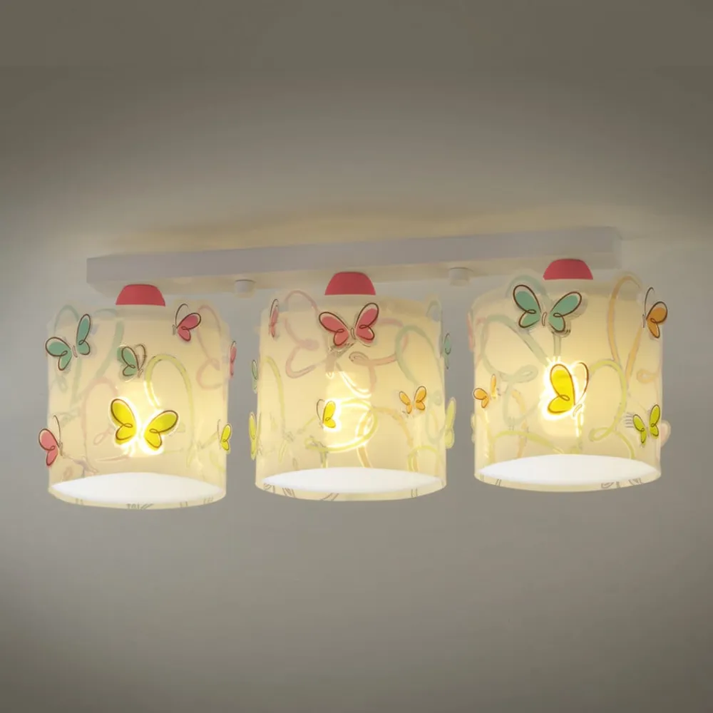 For godt humør på børneværelset: Butterfly-loftslampen med tre lys og farverigt print De mange farverige sommerfugle på Butterfly-loftslampens skærme ser ud til at flyve rundt på en vidunderlig let og munter måde. Det får hurtigt smilet frem hos beskueren, uanset om det er de små indbyggere på børneværelset eller voksne.