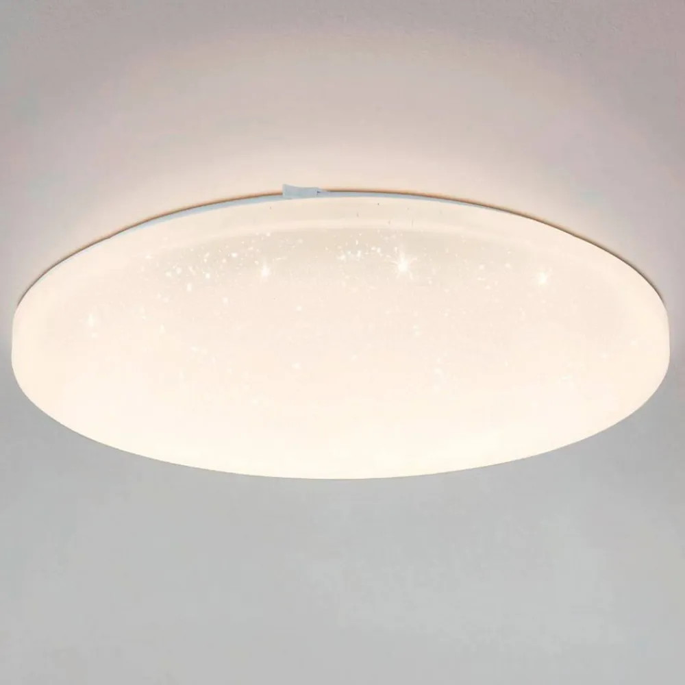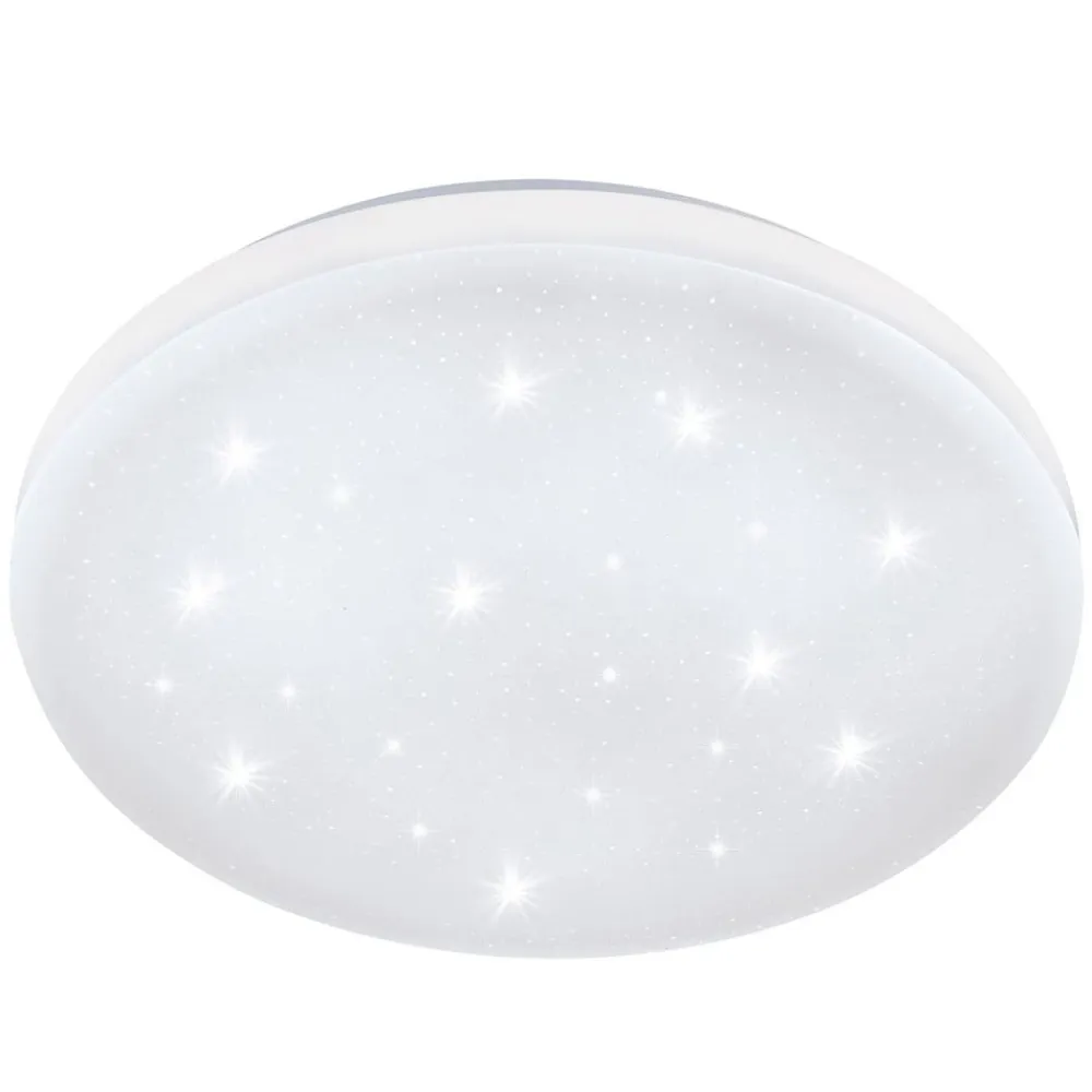 Frania-S LED-loftlampe er en lyskilde til generel belysning, der kan bruges næsten universelt i alle rum og omgivelser.Loftselementet i lyset er lavet af stål, lampeskærmen er lavet af plast. Skærmen har en krystaleffekt, der næppe kan ses, når den er slukket. Så snart lampen er tændt, vises der dog en blinkende stjernehimmel på skærmen, hvorpå mindre og større stjerner glitrer som krystaller.