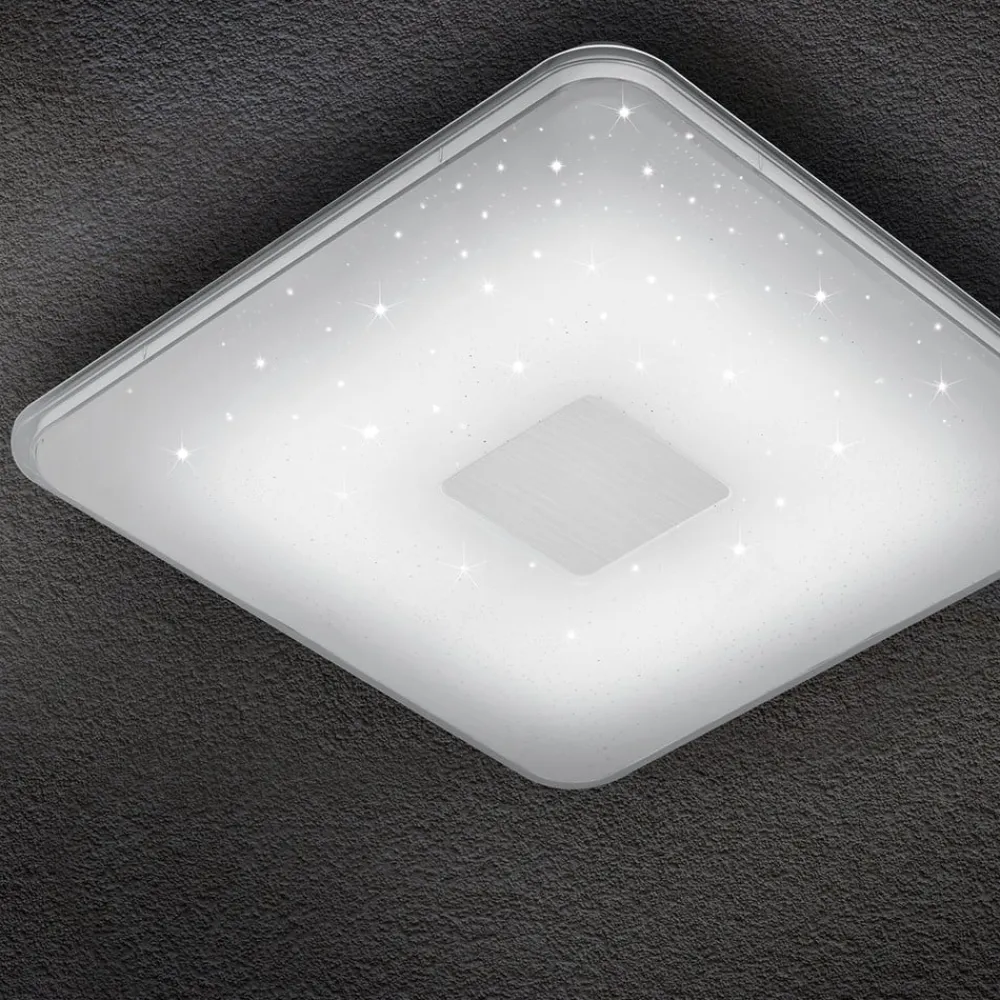 LED loftslampen Samurai holder enkelte funktioner klar, som gør livet dejligere i brugerens hjem. Den medfølgende fjernbetjening gør det muligt at styre alle funktioner efter behov. Således kan man regulere lysstyrken med den eller også vælge lysfarve blandt varmhvid, universalhvid og dagslys. Det giver en lang række forskellige atmosfærer og gør lampen alsidigt anvendelig. Desuden har den en natlampefunktion. Om natten funkler den fiktive stjernehimmel i loftet og indbyder til at drømme. Loftslampens udseende er præget af en kvadratisk form med afrundede hjørner og fuldendes af et lille kvadrat i midten af lampens plastskærm. Samurais funktioner er lige så omfattende som anvendelsesmulighederne.