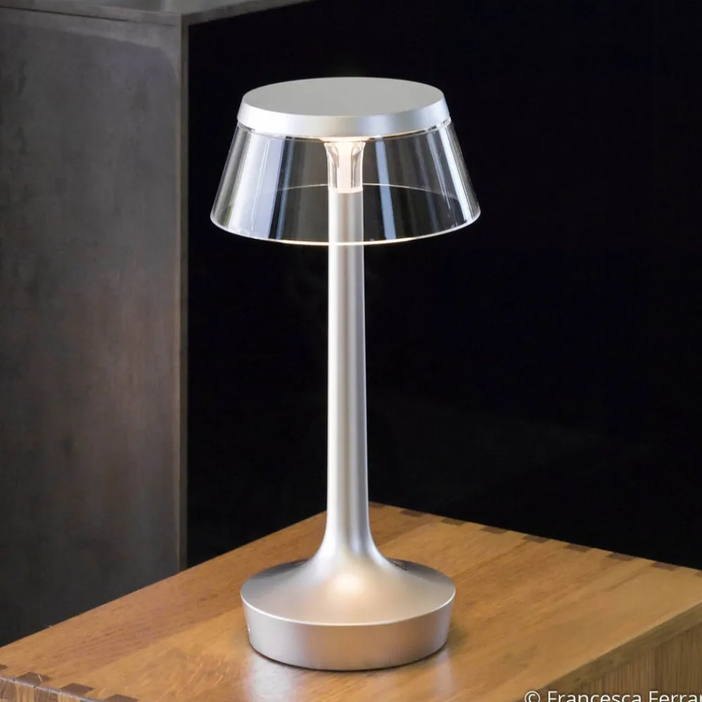 Da han designede Bon Jour unplugged-bordlampen, var det ikke kun vigtigt for designeren Philippe Starck, at lampen er mobil, men også at den har et design, der ikke er almindeligt. Det er bestemt lykkedes ham med dette armatur, for tro mod sit motto “Ethics of the essential” har han undladt unødvendige gimmicks i designet og har derfor valgt et meget ligetil og puristisk design, som sætter særlige accenter i stuen. En klar PMMA-skærm troner på den matkromede armaturfod, som lader det varmhvide LED-lys stråle uhindret ud i omgivelserne. Det udsendes dog hovedsageligt i retning af bordets overflade, så der ikke opstår nogen ubehagelig blænding, og der skabes en indirekte belysning.