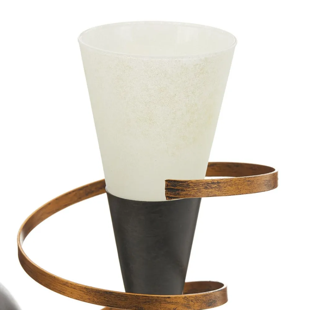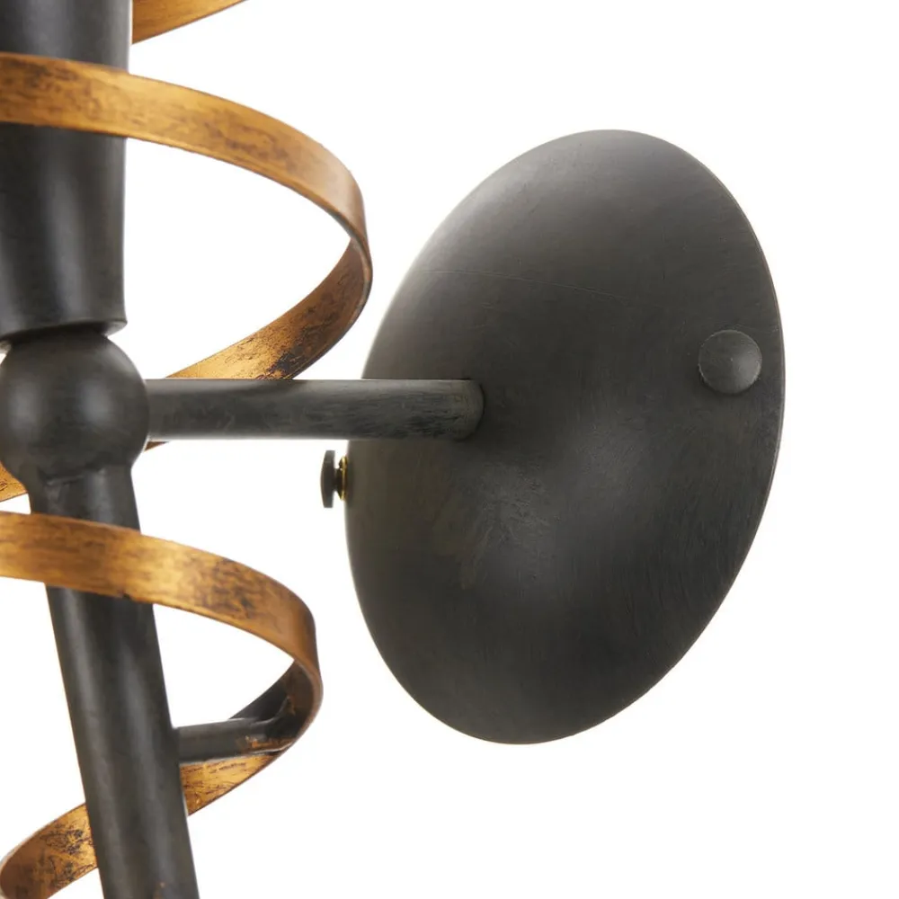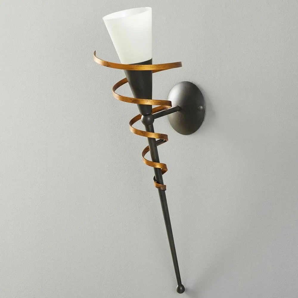 Stilfuld vægfakkel BONITO af sortlakeret metal med antik finish, med stor guldfarvet spiral og hvidt Scavo-glas Denne vægfakkel BONITO i høj kvalitet imponerer med sit stemningsfulde lys og dekorative design og passer særligt godt ind i en rustik atmosfære i både private og gastronomiske omgivelser. Et blikfang af en særlig slags.