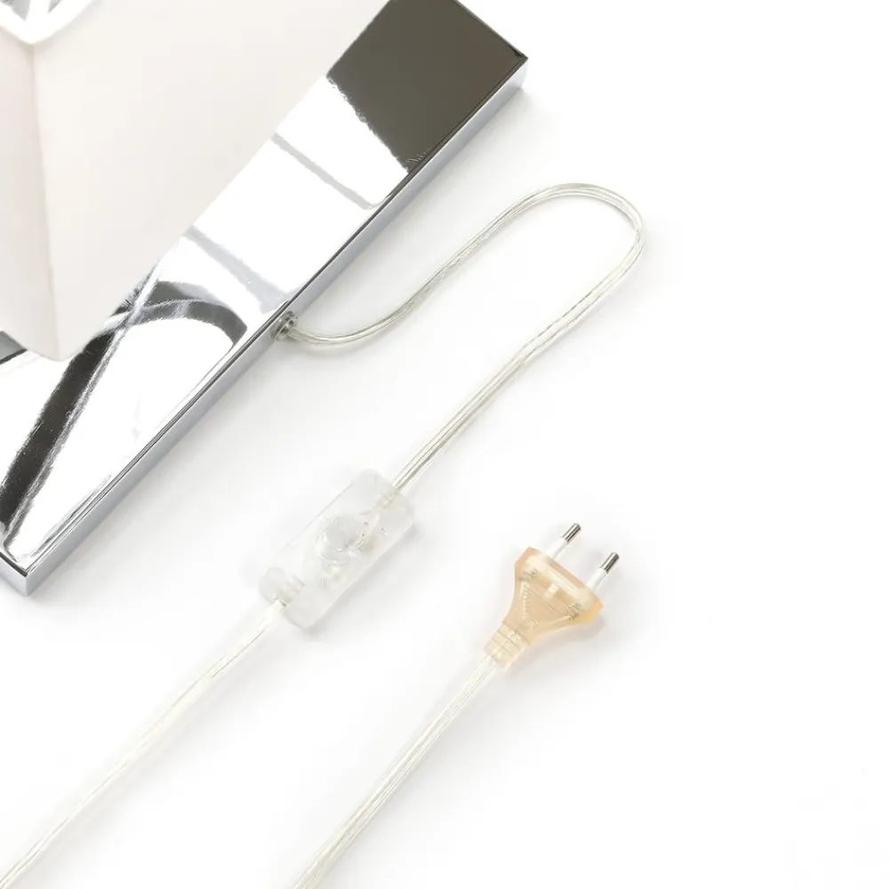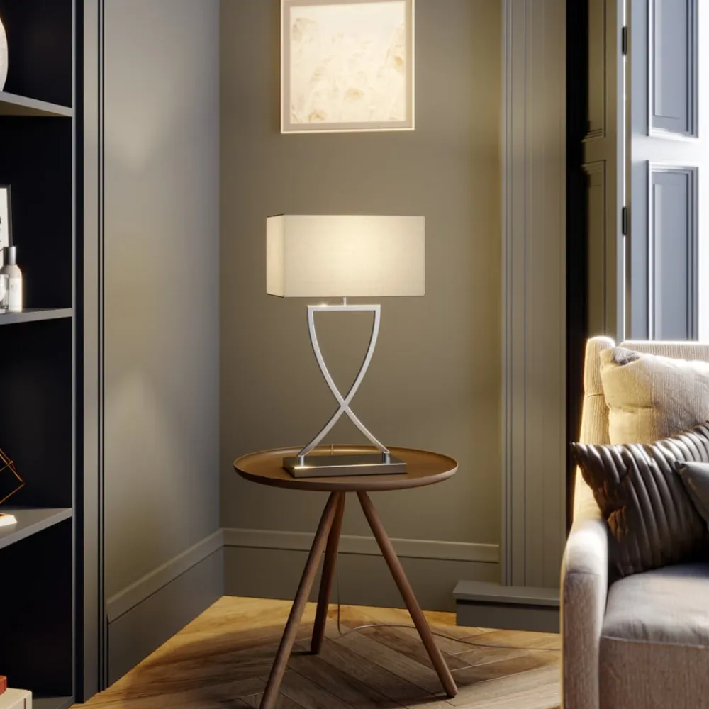 Ren elegance – Evaine bordlampe Enkelhed og elegance, disse to ord beskriver meget godt Evaine bordlampen. Den har en rektangulær, moderne lampeskærm i behagelig hvid, som troner på et kromfarvet stel. Det er stilfuldt buet og giver et særligt blikfang. Evaine er ideel til ekstra belysning i moderne opholdsrum, f.eks. på en kommode i stuen.