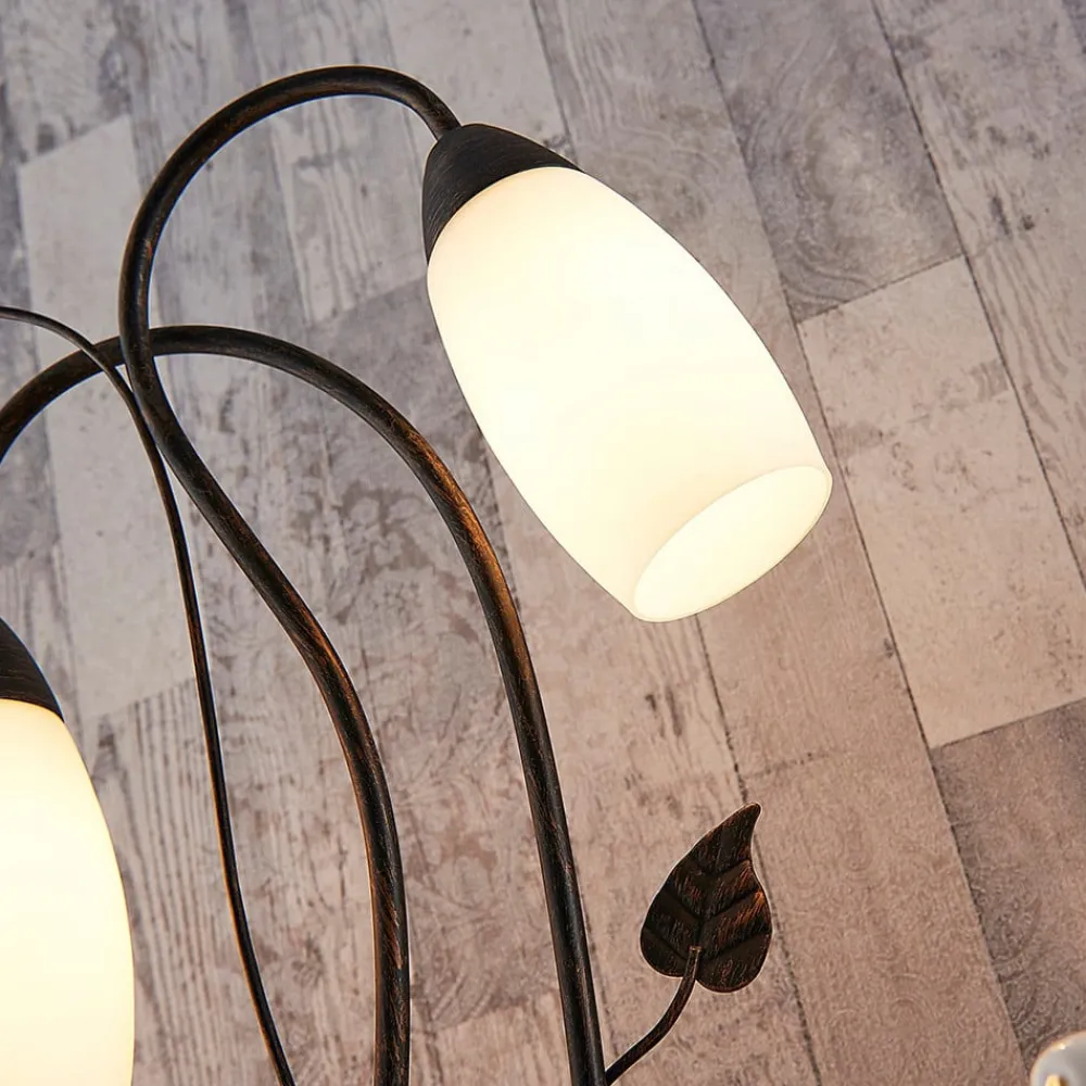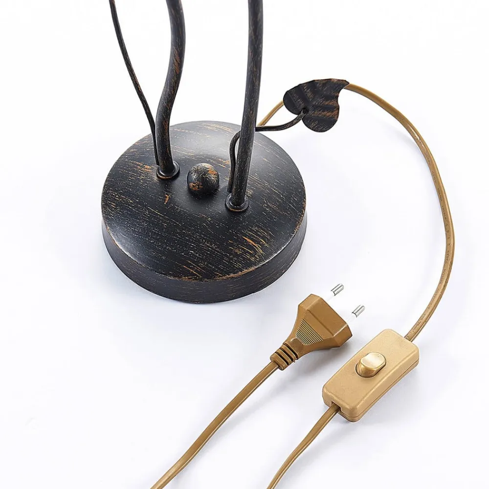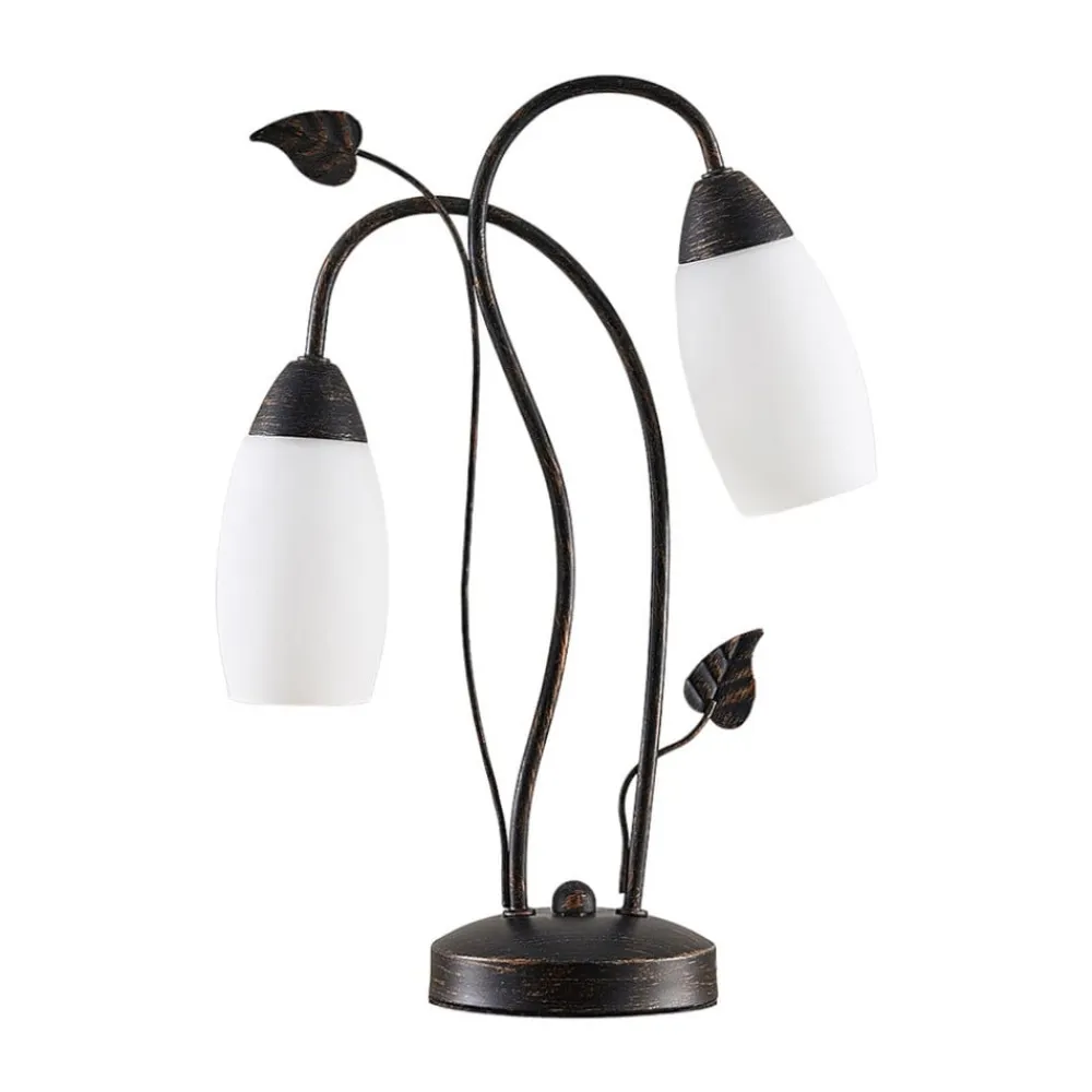 Stefania to-lys bordlampe med blomsterlook Stefania ser lidt legesyg ud med sit let blomstrede design og buede former. Metallet er sort og har fine penselstrøg i guld, som får overfladen til at virke mere brunlig og også giver den mere elegance. Alt i alt er bordlampen en meget dekorativ tilføjelse til opholdsrummet og giver en stemningsfuld belysning om aftenen.