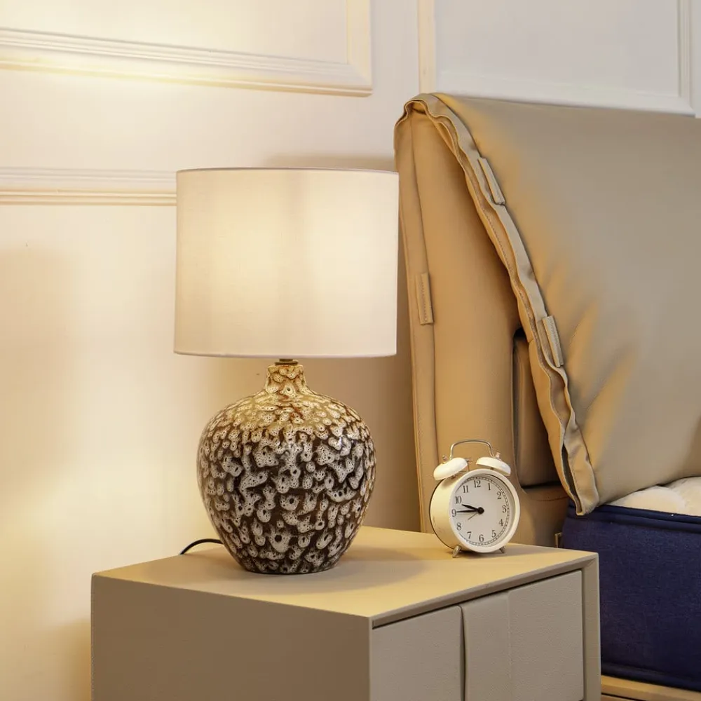 Dekorativ Thalassia-bordlampe med mønstret keramikfod Thalassia-bordlampen består af en keramikfod og en hørskærm. Kombinationen af materialer og farver skaber en særlig harmonisk effekt og gør lampen til et smukt blikfang, selv når den er slukket. Den lyse hørskærm sender et blændfrit, varmt lys ud i omgivelserne. Den mønstrede base skaber en dekorativ accent i opholdsrummet. Bordlampen tændes og slukkes ved hjælp af en kontakt på ledningen. Thalassia kan med fordel bruges som lyskilde i entréen eller stuen.