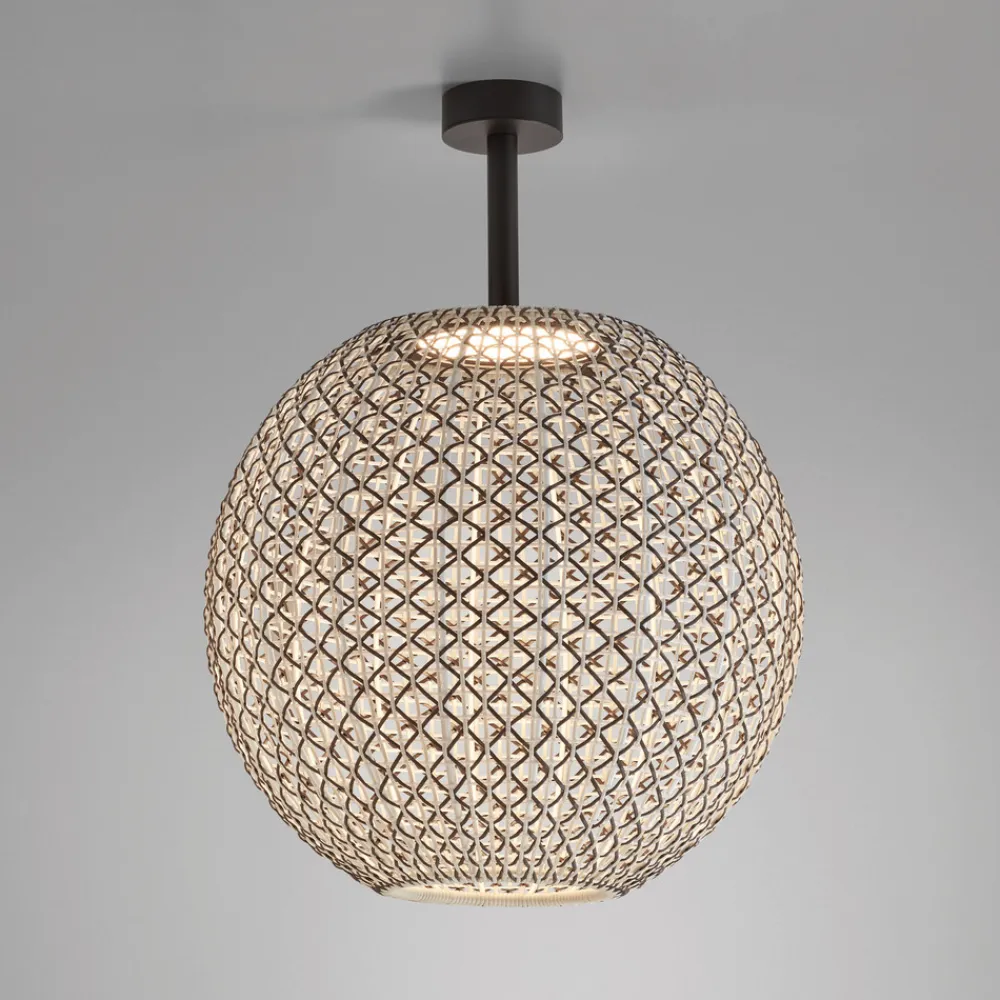 Designer udendørs loftslampe Nans Sphere PF med vævet skærmDesignfirmaet Bover, der har base i Barcelona, legemliggør middelhavsstilen med sine Made in Spain-produkter. Loftslampen Nans Sphere er designet til udendørs brug, men kan også bruges indendørs. Den kugleformede skærm er vævet af en syntetisk fiber med forskellige farvede tråde vævet sammen. Loftslampen er triac-dæmpbar, lysdæmperen medfølger ikke.