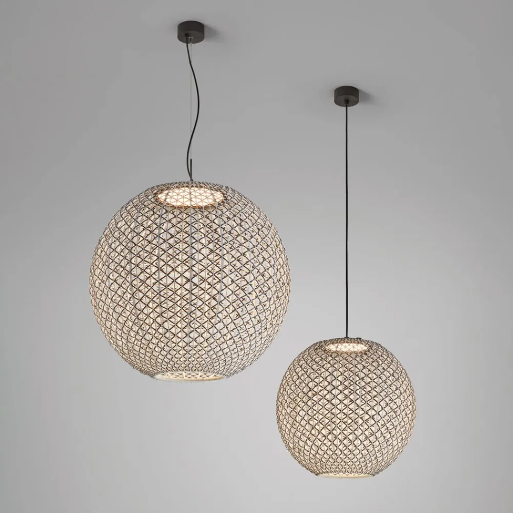 Designer udendørs pendel Nans Sphere S med vævet skærmDesignfirmaet Bover, der har base i Barcelona, legemliggør middelhavsstilen med sine Made in Spain-produkter. Pendellampen Nans Sphere er designet til udendørs brug, men kan også bruges indendørs. Den kugleformede skærm er vævet af en syntetisk fiber, hvor forskellige farvede tråde er vævet ind i hinanden. Pendlen er triac-dæmpbar, lysdæmperen er ikke inkluderet.