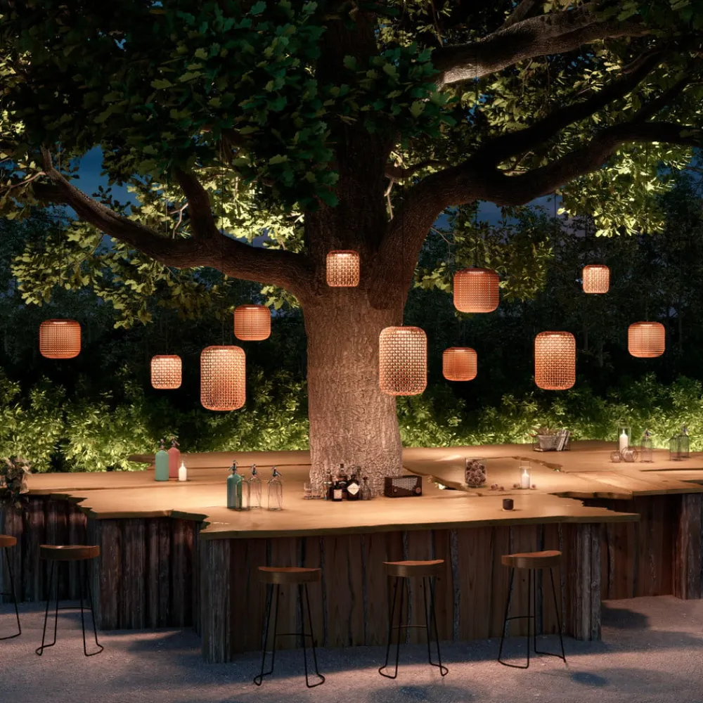 Designer udendørs pendel Nans A med vævet skærmDesignfirmaet Bover, der har base i Barcelona, legemliggør middelhavsstilen med sine Made in Spain-produkter. Pendellampen Nans er designet til udendørs brug, men kan også bruges indendørs. Den cylindriske skærm er vævet af en syntetisk fiber, hvor forskellige farvede tråde er vævet ind i hinanden. Pendlen er triac-dæmpbar, lysdæmperen er ikke inkluderet.