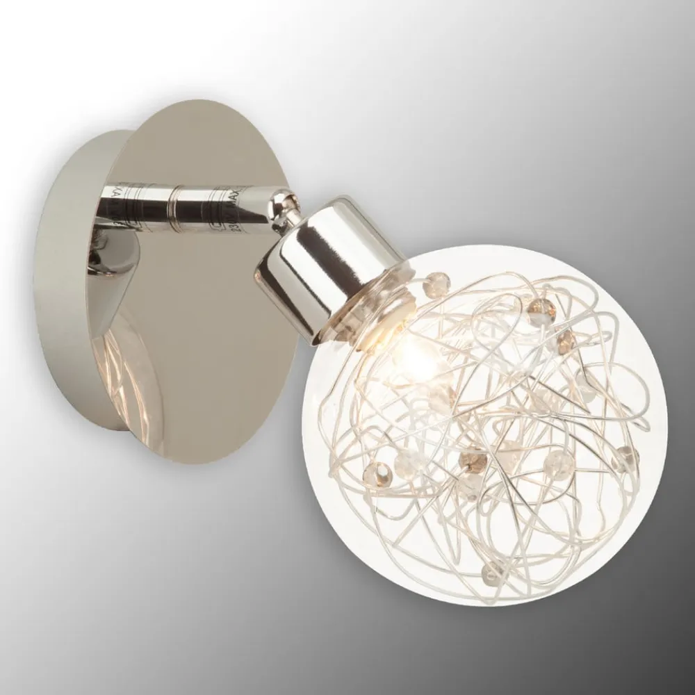 Den runde vægholder med led og fatning/skærmholder på væglampen Joya består af forkromet metal. Skærmen på væglampen Joya – en kugle af klart glas, som er fyldt med rødligt skinnende dekoration – lader sig justere takket være et led. Væglampen er bestykket med en G9-halogenpære (medfølger ikke ved leveringen).