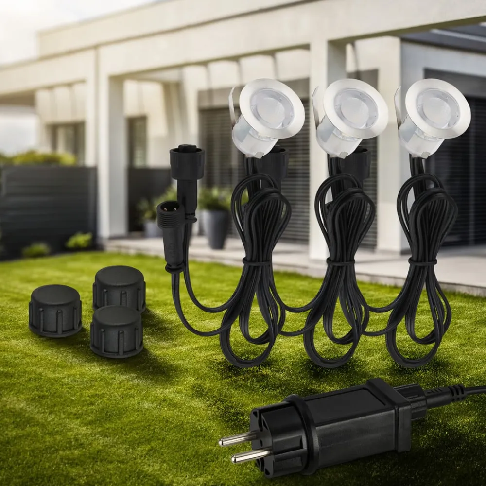 Dette sæt med tre varmhvide LED-indbygningsspots er et komplet sæt til Briloners 12 V udendørslampe-system. De runde spots har rustfrit stålhus og plastdæksel og leveres med passende tilslutningskabler med stik til 12 V-systemet. En udendørs stiknetadapter til 230 V-tilslutning til stikkontakten medfølger. Afhængigt af behovet kan yderligere komponenter (se tilbehør) eller lamper fra 12 V-systemet tilføjes.