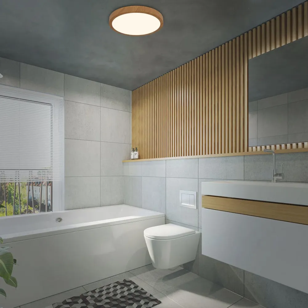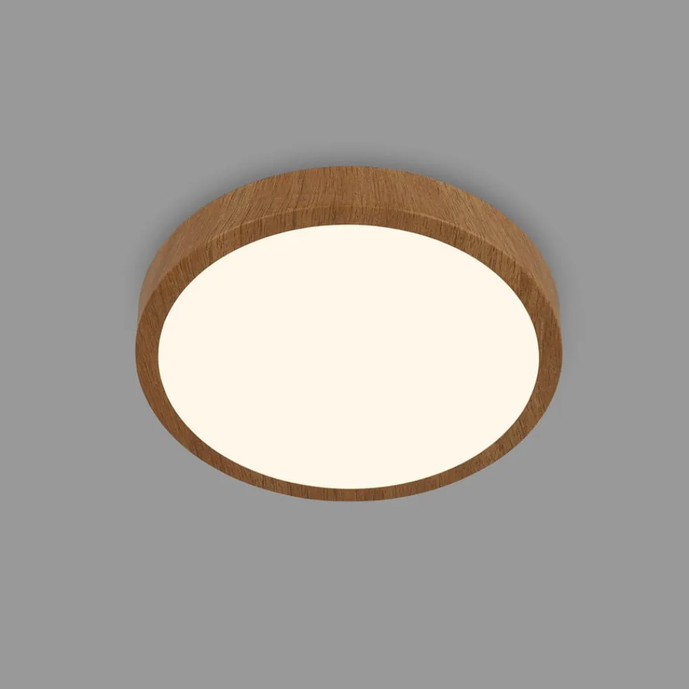Flad LED-loftlampe Runa Wood med træfarvet metalramme