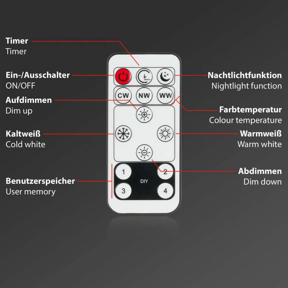 Sort LED-panel Slim – multifunktionelt justerbart LED-panelet Slim er det perfekte valg til alle, der er på udkig efter moderne og stilfuld belysning. Med sit ultraslanke design og elegante sorte plastramme passer det perfekt ind i ethvert hjem eller kontor. Med den medfølgende fjernbetjening kan lysets farvetemperatur justeres fra lysfarven varm hvid til dagslys. Desuden er panelet dæmpbart og har en baggrundsbelysningseffekt, der giver ekstra accenter. Et andet højdepunkt er den 30-minutters timer, som slukker panelet automatisk. Og hvis der er brug for blødt lys om natten, kan natlyset tændes. Særligt praktisk er DIY-knappen, som kan bruges til at gemme op til fire indstillinger.