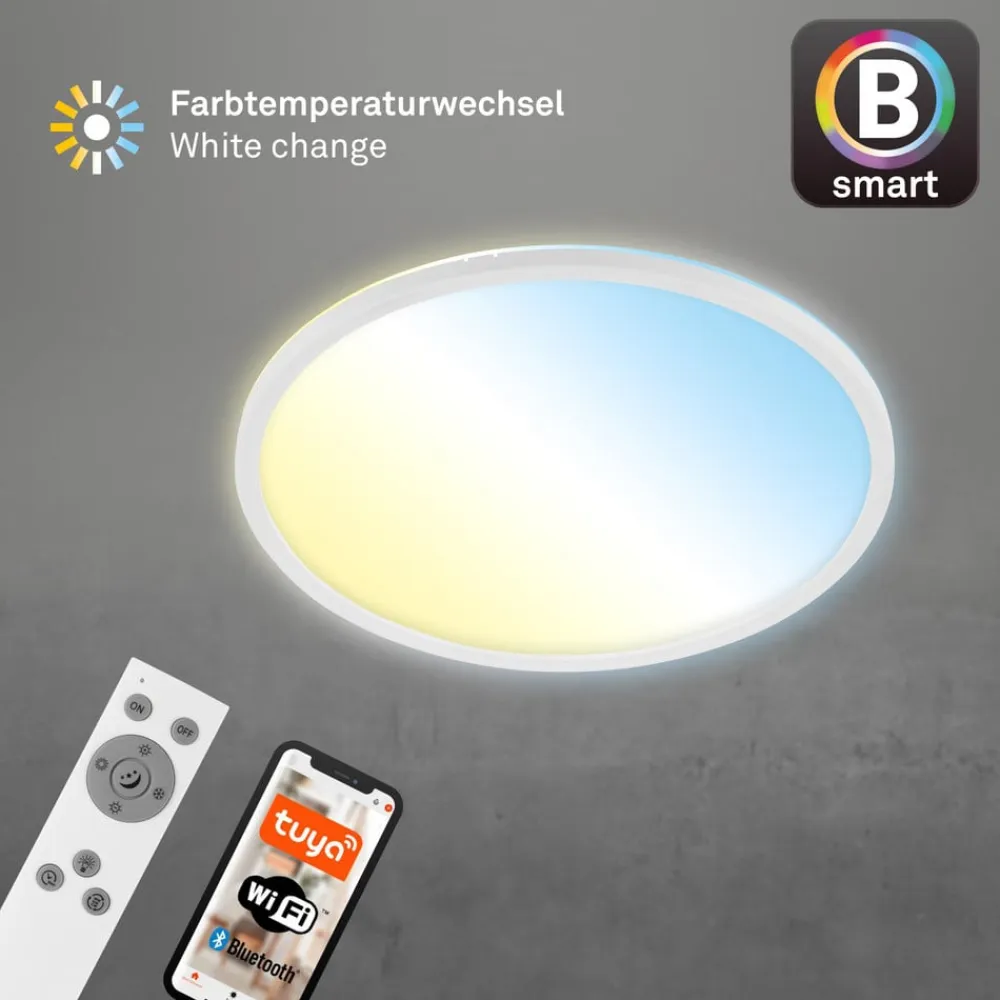 LED-loftslampe har en CCT-funktion, hvor farvetemperaturen kan ændres fra varm til dagslys hvid. Desuden kan lysstyrken på lampen reguleres. Derudover er der indbygget en natlampe-, en timer- og en hukommelsesfunktion. De enkelte funktioner styres med den medfølgende fjernbetjening, via den gratis tuya-app eller via stemmekommando.
