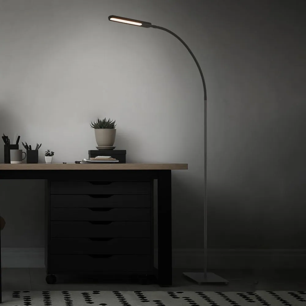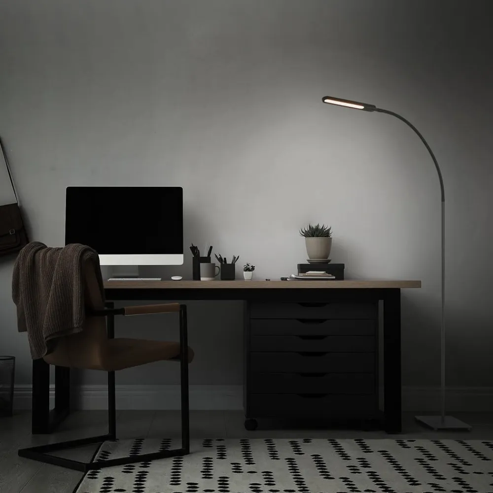Servo LED-gulvlampen er den ideelle lyskilde til belysning af skrivebordet. Med de to berøringsafbrydere på armaturhovedet kan lysstyrken dæmpes i tre trin og lysfarven justeres. På denne måde kan lysforholdene tilpasses optimalt til de individuelle behov. Desuden gør det fleksibelt justerbare armaturhoved det også muligt at justere lysindfaldet efter ønske i enhver situation. Takket være den integrerede hukommelsesfunktion kan den sidst anvendte lysindstilling gemmes, så de tidligere indstillede lysforhold er tilgængelige, næste gang armaturet tændes. Takket være det diskrete design er Servo en alsidig lyskilde, der ser lige så godt ud på hjemmekontoret som på virksomhedskontoret.