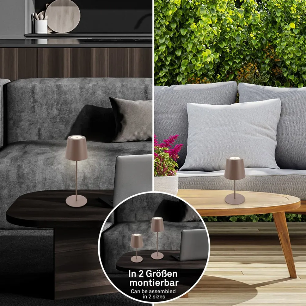 Rund LED-bordlampe med genopladeligt batteri og touchdæmper Denne LED-bordlampe i metal med rund fod og tidløs lampeskærm med kegleform er en alsidig ekstra lyskilde til indendørs og udendørs brug. Lyset fra den integrerede LED-lyskilde sendes nedad, så den omgivende bordoverflade oplyses uden at blænde. Den styres via touch-kontrolfladen på hovedet. Takket være det genopladelige batteri kan LED-bordlampen bruges på farten – Kapslingsgrad: IP44 – Dæmpningsniveauer: 100% / 50% / 15% – Inkluderer USB-opladerkabel til opladning i et tørt indendørs område – Belysningens varighed: 15 timer ved 15% lysudbytte – Inkluderer to stelstænger til montering i forskellige størrelser