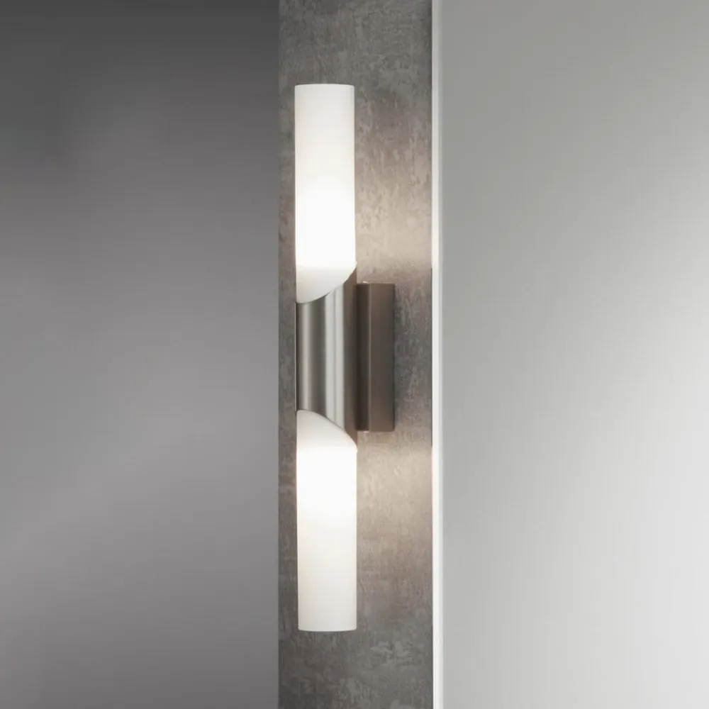 Splash væglampe til badeværelset med 2 lyskilder og vippekontakt Splash væglampen til badeværelset består af to matte hvide glasskærme, der giver en klar, blændfri belysning. Den matforniklede overflade giver en kontrast. Væglampen kan placeres ved siden af et spejl og give passende belysning på badeværelset. Væglampen til badeværelset er udstyret med to E14-fatninger, som sidder bag det rørformede glas, og en vippekontakt til ubesværet betjening på stedet.