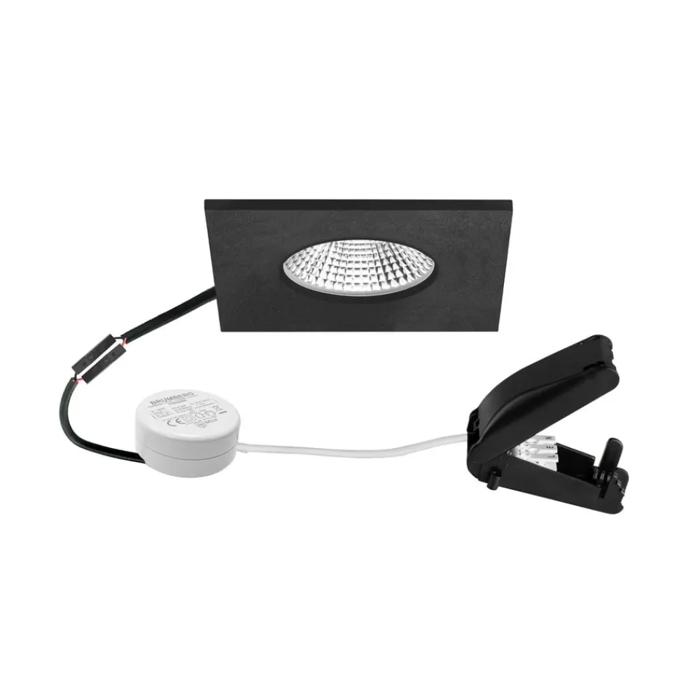 LED-indbygningsspot BB21 IP65 med rund konverter, RC-dæmpbar og tilslutningsboks Det kantede LED-indbygningsspot leveres som et tilslutningsklart sæt med en rund LED-konverter, der kan dæmpes med en bagkantsfasedæmper (RC), og en tilslutningsboks. Den kan bruges til at belyse wellness-områder, badeværelser og mange andre fugtige rum i den private eller kommercielle sektor. Den udsender varmhvidt lys med en udstrålingsvinkel på 36°, som fordeles optimalt af den rotationssymmetriske sølvfarvede reflektor med dyb, bredstrålende lysfordeling og transparent plastafdækning. Med beskyttelsesklasse IP65 er den støvtæt og beskyttet mod vandstråler og kan også installeres i brusere osv. Udstyret med monteringsfjedre til værktøjsfri montering i lofter med en tykkelse på op til 1,7 cm – Inklusive elektronisk forkobling (rund konverter), bagkant dæmpbar (RC) – Med tilslutningsboks, 3-polet til gennemfortrådning – Tilladt omgivelsestemperatur – 20 til 25 °C – Må ikke dækkes med varmeisolerende materiale – Høj beskyttelsesgrad IP65