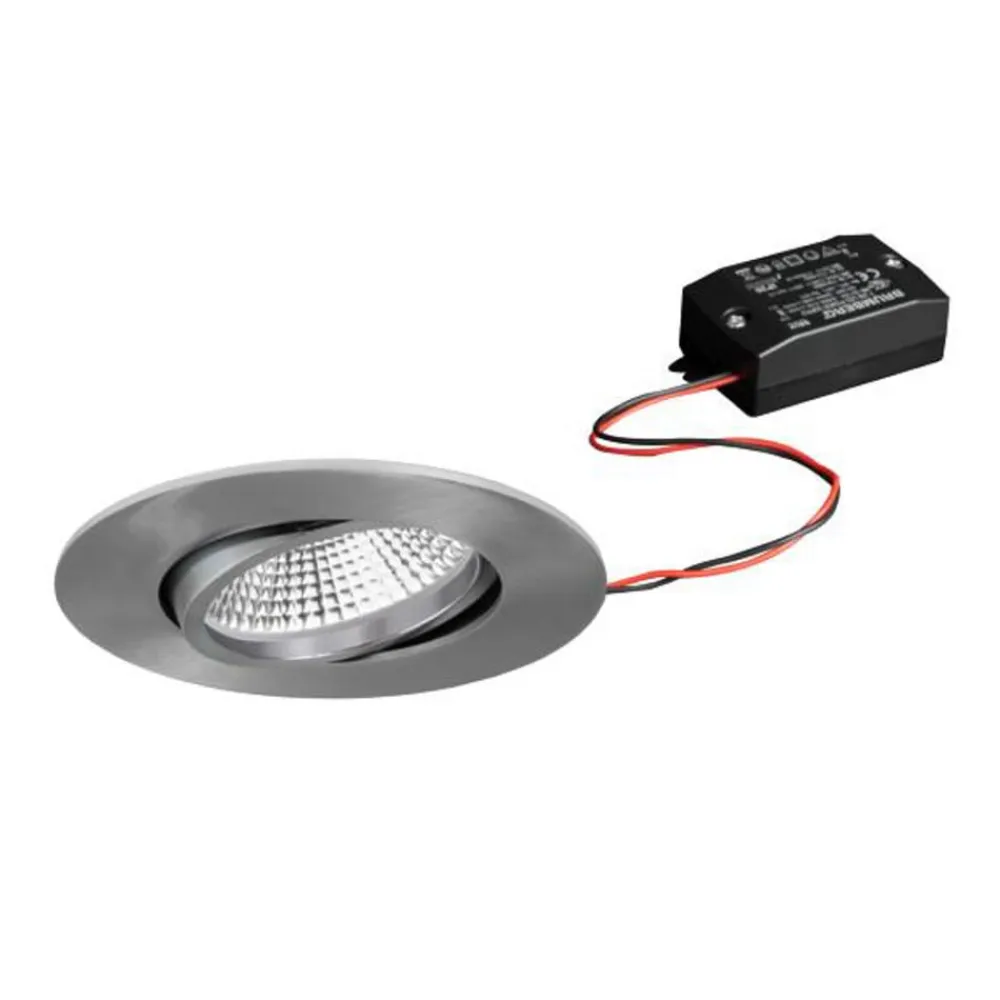LED-indbygningsspot BB23 med omskiftelig LED-driver og IP65, drejelig Til badeværelser, wellnessområder og mange andre fugtige rum i den private eller kommercielle sektor er denne LED-downlight BB23, som kan drejes 15° hele vejen rundt, støvtæt og beskyttet mod vandstråler med beskyttelsesklasse IP65. Den kan monteres uden værktøj ved hjælp af monteringsfjedre, kan installeres i lofter med en tykkelse på op til 1,7 cm og er ikke dæmpbar. Downlighten udsender varmhvidt lys i en vinkel på 36° og fordeles optimalt af den sølvfarvede reflektor med rotationssymmetrisk dyb lysfordeling gennem den gennemsigtige plastafdækning.
