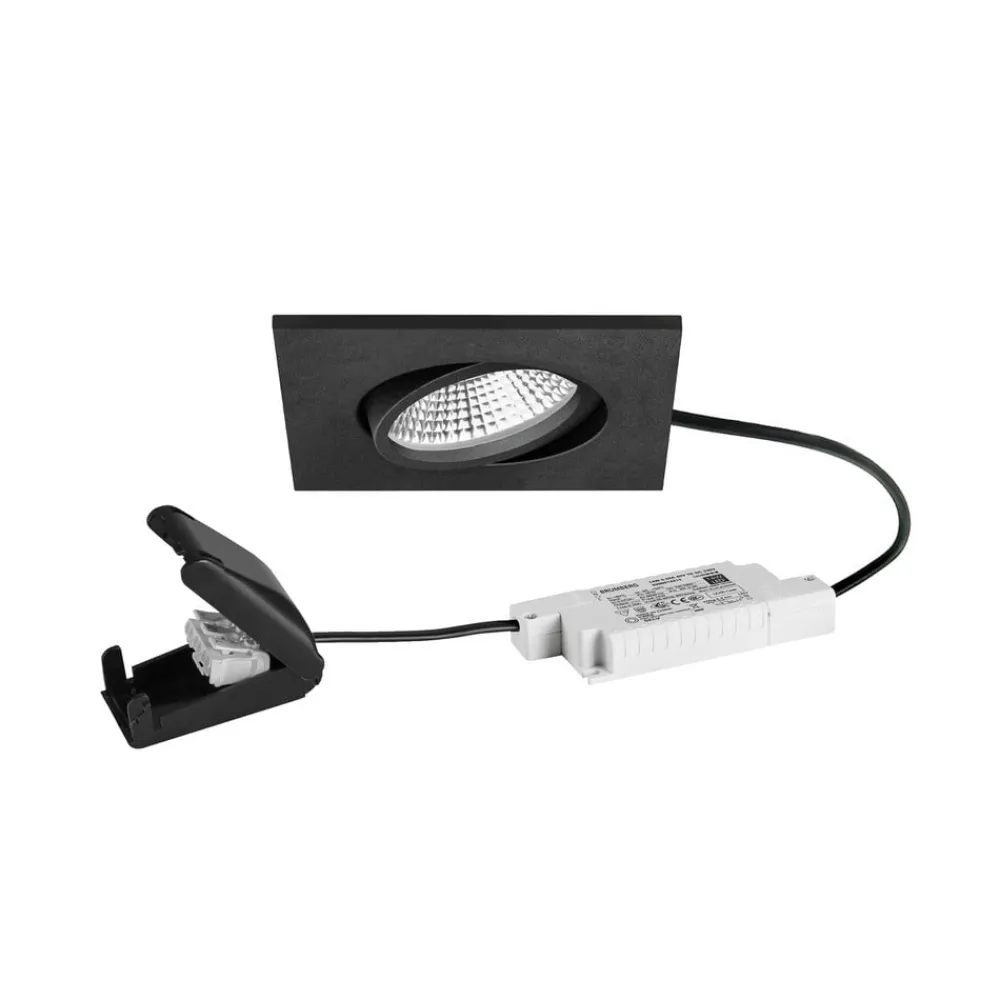 BB25 LED-indbygningsdownlight med dæmpbar LED-driver og tilslutningsboks Dette firkantede LED-indbygningsspotsæt består af et rundt, drejeligt spotlight i et firkantet hus, en LED-driver (RC), der kan dæmpes med en bagkantsfasedæmper, og en tilslutningsboks. Downlighten, som kan drejes 15° hele vejen rundt og har en høj IP5-beskyttelsesgrad, kan bruges til at belyse fugtige rum som badeværelser, wellnessområder, saunaer osv. Spotlightet er udstyret med en varmhvid LED i en sølvreflektor med rotationssymmetrisk, dyb lysfordeling bag en transparent plastafdækning og udsender lys med en strålevinkel på 36°. Udstyret med monteringsfjedre til værktøjsfri installation – maksimal lofttykkelse 1,7 cm – inklusive elektronisk forkobling, bagkant dæmpbar (RC) – med tilslutningsboks, 3-polet til gennemfortrådning – tilladt omgivelsestemperatur – 20 til 25 °C – må ikke dækkes med varmeisolerende materiale – høj IP65-beskyttelsesgrad – kan drejes 15°