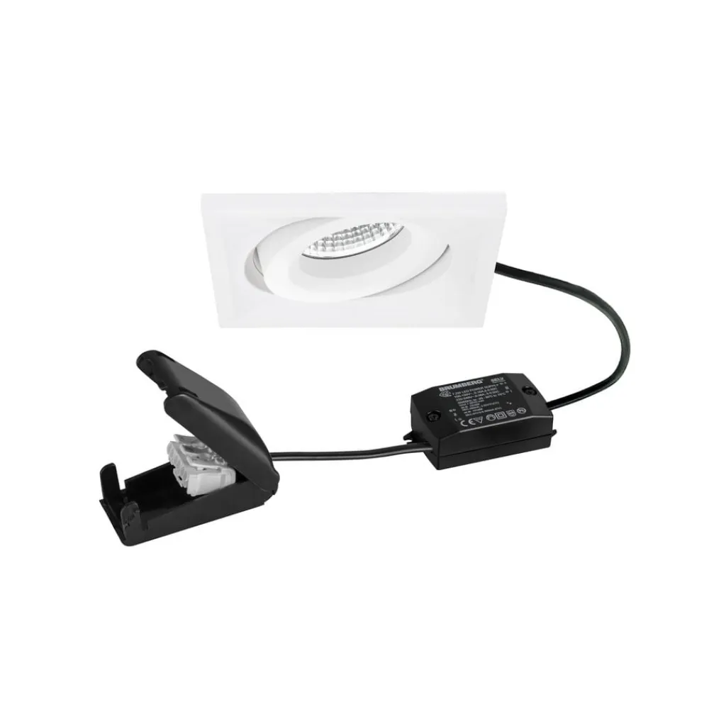 BB37 LED-indbygningsspot med tænd/sluk-betjening og tilslutningsboks LED-indbygningsspot BB37 med firkantet ramme kan drejes 20°, så det udsendte lys skinner i den ønskede retning. Den leveres som et komplet sæt, der er klar til tilslutning, med et elektronisk, omskifteligt kontroludstyr og en tilslutningsboks. Installation i lofter med en maksimal tykkelse på 1,5 cm kan udføres uden værktøj takket være installationsfjedre. Udstyret med en sølvreflektor med rotationssymmetrisk, smal- og bredstrålende lysfordeling og en transparent polykarbonatafdækning garanteres højt lysudbytte og optimal lysfordeling – inkl. elektronisk tænd/sluk-betjening, ikke-dæmpbar – inkl. tilslutningsboks, 3-polet til gennemfortrådning – tilladt omgivelsestemperatur (ta): -20 °C – +25 °C – spot kan drejes 20° hele vejen rundt – maksimal loftstykkelse 1,5 cm