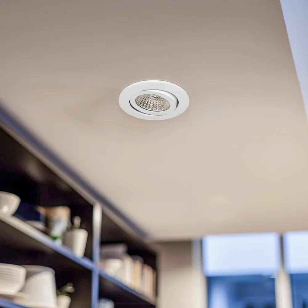 LED-indbygningsspot BB03, dæmpbar faseafbryder (RC), drejelig, driver vinklet Det runde indbygningsarmatur BB03, fremstillet af aluminium, er det passende downlight til private såvel som offentlige interiører med moderne indretningsstil, såsom eventhallen på hotellet eller gangen. LED’erne er placeret i et hoved udstyret med en reflektor, som er bevægelig hele vejen rundt og dermed kan orienteres mod det ønskede område. Den dæmpbare ballast og monteringsfjedrene til værktøjsfri fastgørelse er inkluderet. – Inklusive vinklet LED-konverter; eksternt dæmpbar via faseafbrydelse (RC) – Udstrålingsvinkel: 38° – Drejeområde: 30° hele vejen rundt – Loftstykkelse: maks. 1,3 cm