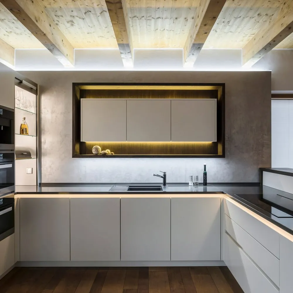 Lysende QualityFlex® LED-strip til profilmontering Denne afkortelige LED-strip er ideel til belysning af lange sektioner som supplerende eller accentuerende belysning i moderne interiør. Især som en indirekte lyskilde over eller bag fremspring og møbler, såsom lange køkkenelementer, skabe eller drinkshylder i barer, viser QualityFlex® sine styrker. LED-strimlen er ikke egnet til direkte limning på møbler eller vægge. Der kræves egnede aluminiumsprofiler (se tilbehør) – Leveringsomfang: 500 cm LED-strip, dobbeltsidet 3M-klæbebånd, tilslutningskabler 350 cm (loddet på) på begge sider, to tilslutningskabler 150 cm (Plug & Play), en strømforsyning – Omgivelsestemperatur: – 10 til 40 °C