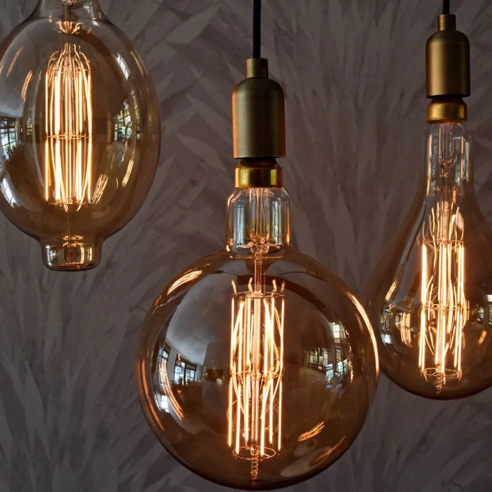 Dæmpbar kolos: E27 LED lampe Colosseum High Lumen Filament, 10,5 W, 1.100 lm, 2.100 KDen kolossale Colosseum High Lumen LED lampe producerer varmt hvidt lys, hvis behagelige effekt forstærkes yderligere af den guldfarvede overflade. Samtidig opnår Colosseum en bemærkelsesværdig lyseffektivitet på 1.100 lumen med et forbrug på kun 10,5 watt. Et andet højdepunkt er de filamenter, der er synlige gennem glasset. Desuden er denne LED-lampe til E27-fatninger dæmpbar.