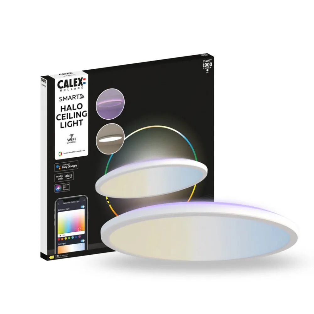 Styres via app: Smart Halo LED-loftlampe med separat kontrollerbart RGB-lys, IP54, CCDen helt hvide Smart Halo LED-loftlampe har to separat koblelige og kontrollerbare lyskilder. Der udsendes indirekte lys mod loftet, hvortil du kan vælge mellem mere end 100 farverige nuancer. Nedad er lyset kraftigt og direkte. Her kan der indstilles forskellige hvidtoner fra varm hvid (2.700 K) til dagslys (6.500 K). Smart Halo styres direkte via WLAN med den gratis Calex-app. En ekstra gateway er ikke nødvendig for dette. Calex Smart Home-systemet er også kompatibelt med Google Assistant, Apple HomeKit og Amazon Alexa. Således kan alle funktioner alternativt styres ved hjælp af stemmekommandoer.Smart Halo er beskyttet mod stænkvand og kan derfor også bruges i beskyttede udendørs områder.Tekniske egenskaber / kompatibilitet- styres via Calex App (gratis til Android og iOS)- farvetemperatur hovedlys justerbar: varm hvid (2.700 K) – dagslys (6.500 K)- ekstra RGB-lys (over 100 lysfarver kan vælges)- timer og foruddefinerede scener kan justeres via app- stemmestyring mulig med Amazon Alexa, Apple HomeKit (Siri) og Google Assistant- lyskilder kan dæmpes separat via app eller stemmekommando- WiFi 2,4 GHz- beskyttet mod stænkvand