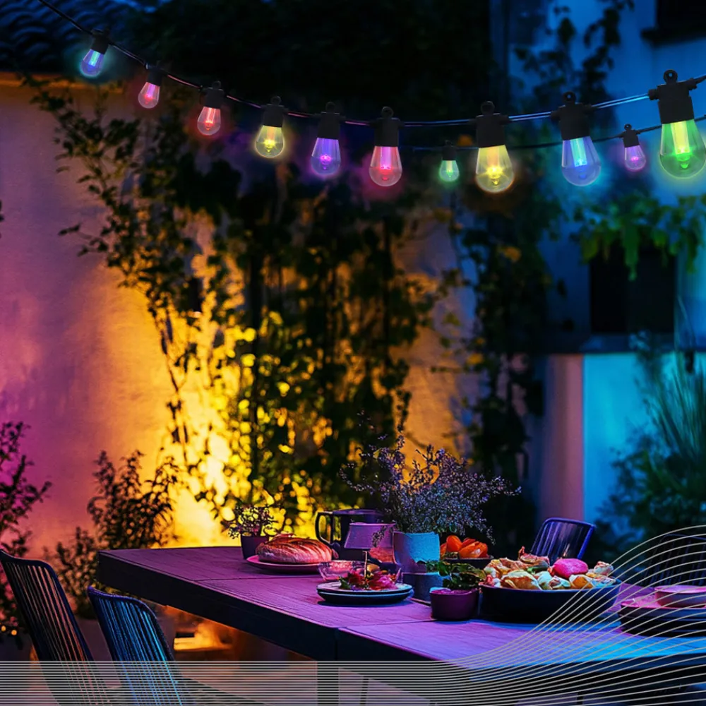 Vibey LED-lyskæde med CCT og RGBIC-farvestyring, 10 lyskilder, 10 meter Oplev, hvordan Vibey LED-lyskæden forvandler udendørsarealer til en oase af velvære. LED-teknologien sikrer en effektiv og langtidsholdbar belysning, der fremhæver enhver lejlighed. Farvetemperaturen (CCT) og det dynamiske farvede lys (RGBIC) kan indstilles ved hjælp af den medfølgende fjernbetjening. Takket være et 5 meter langt tilslutningskabel med stik forbliver Vibey dynamisk, ikke kun når det gælder belysning. Tekniske egenskaber – med fjernbetjening (inkl. batteri) – justerbar farvetemperatur (CCT) fra varmhvidt lys (2.700 K) til dagslys-hvidt lys (6.500 K) – klar til brug med det samme takket være 5 meter langt tilslutningskabel og integreret driver