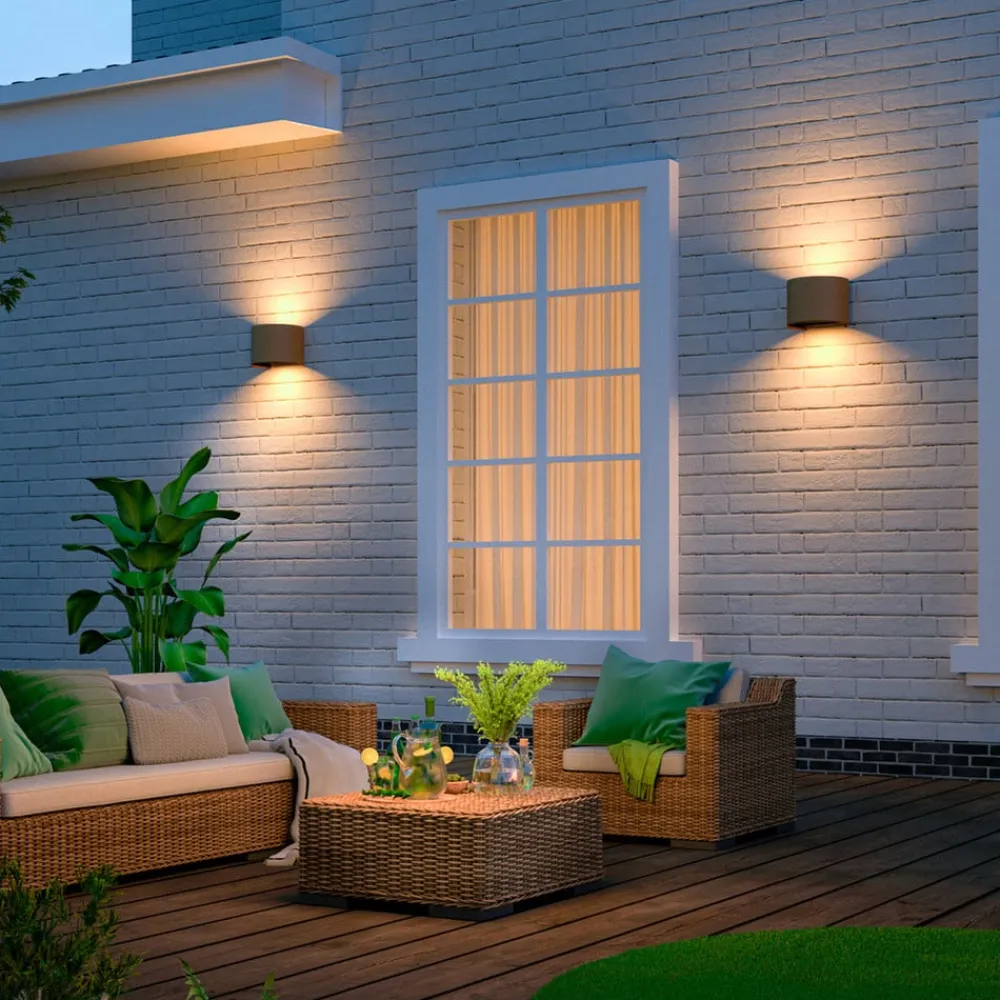 Udendørs væglampe Oval er beregnet til moderne accent- og orienteringsbelysning på facader og indgangsområder. Huset er fremstillet af aluminium og plast og er udformet som en udskæring af en cylinder og har en ensfarvet finish. Bag plastdæksler er der integreret to varmhvide LED-lyskilder, hvis lys udsendes opad og nedad.