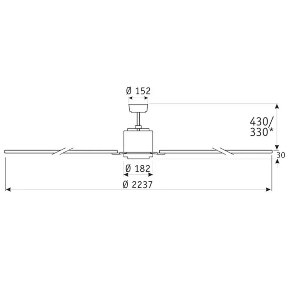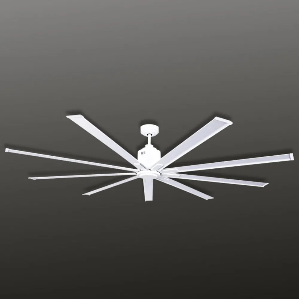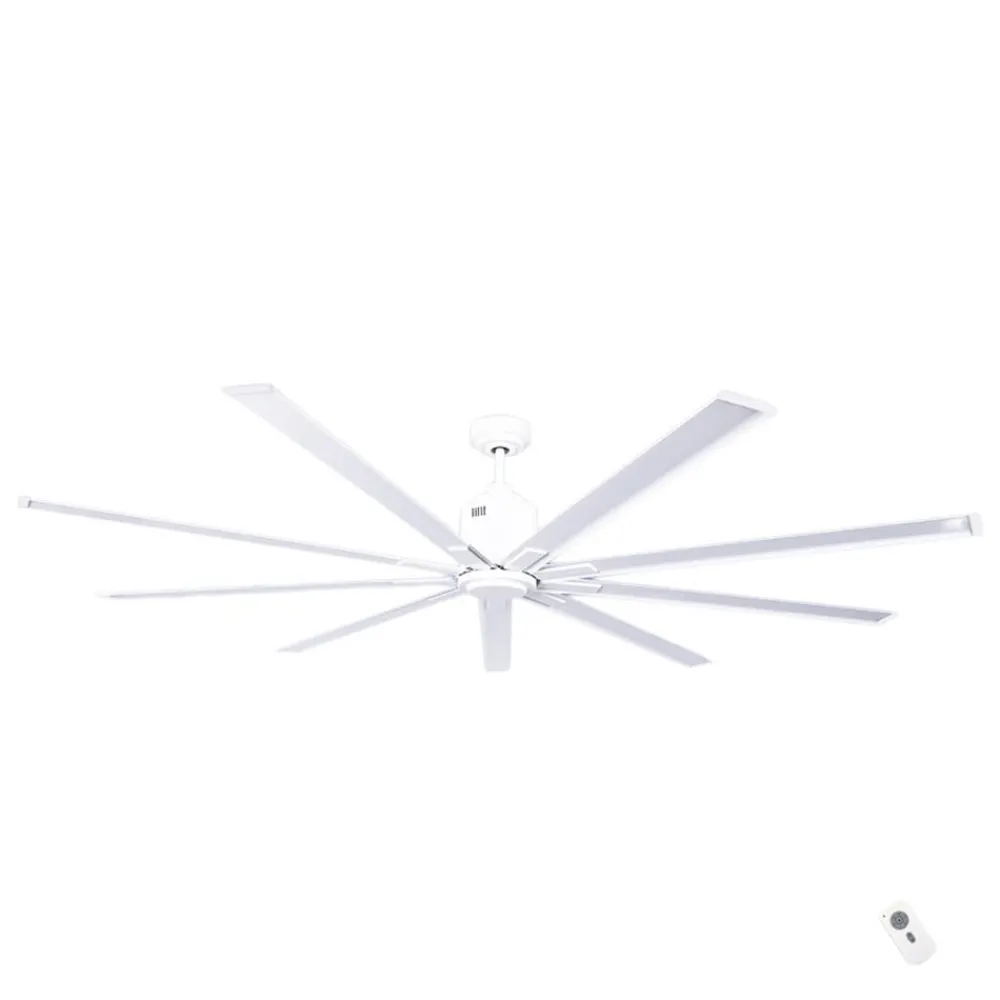 Ni aerodynamisk optimalt profilerede blade og en diameter på 220 cm resulterer i en enorm luftydelse for denne hvide loftventilator, som med sit moderne udseende passer til mange boligstile. Fjernbetjening og vægbeslag er inkluderet.