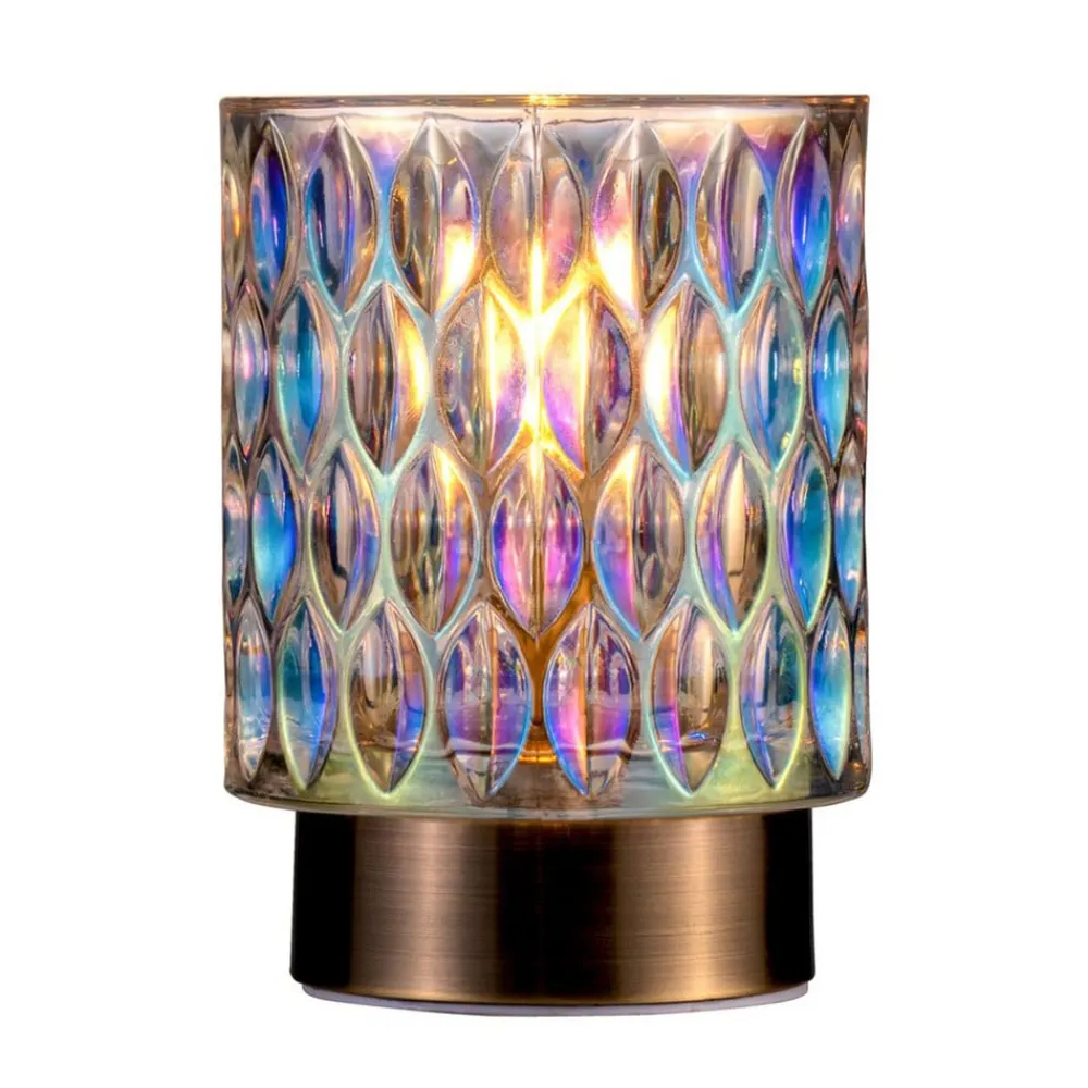 Den stilfulde Clear Glamour LED deco bordlampe består af en base af metal med en børstet messingfinish og en skærm af dichroisk glas. Dette sikrer, at lyset skinner i forskellige farver afhængigt af synsvinklen. En matchende LED-pære er allerede inkluderet i leveringsomfanget.