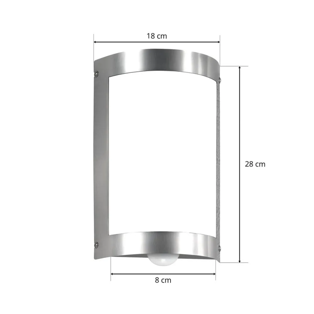 Rustfrit stål danner rammen om denne smukke udendørs væglampe. Lampens front er dækket af satineret glas, der sikrer en behagelig, blændfri belysning, som oplyser indgangs- og udendørsarealer optimalt. Designet fremstår meget eksklusivt og vellykket.