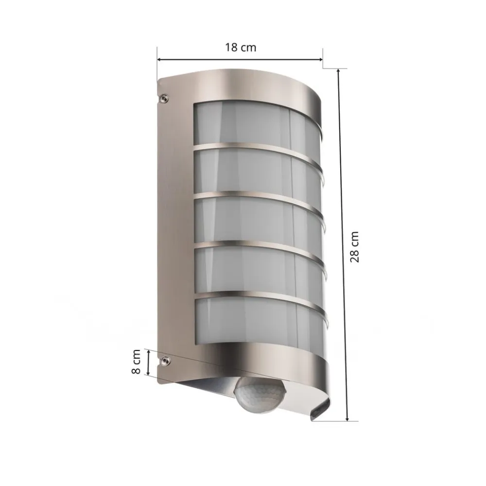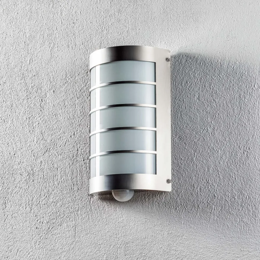 Moderne Marco1 udendørs væglampe med satineret glasRustfrit rustfrit stål og satineret glas skaber en smuk udendørs væglampe, der ser stilfuld og moderne ud på samme tid. Det halvcirkelformede hus er prydet med et satineret glas, der har nogle dekorative stivere. Materialer af høj kvalitet og deres kvalificerede og omhyggelige udførelse kendetegner udendørslamperne fra denne producent, som er fremstillet i Tyskland og alle udstyret med den nyeste teknologi. Tekniske data bevægelsesdetektor: – Koblingskapacitet: maks. 120 watt- Montering: 230 V / 50 Hz- Registreringsvinkel: ca. 120°- Tidsindstilling: 10 sek. – 8 min.- Skumringsindstilling: 10 – 2000 lux- Rækkevidde: maks. 8 m