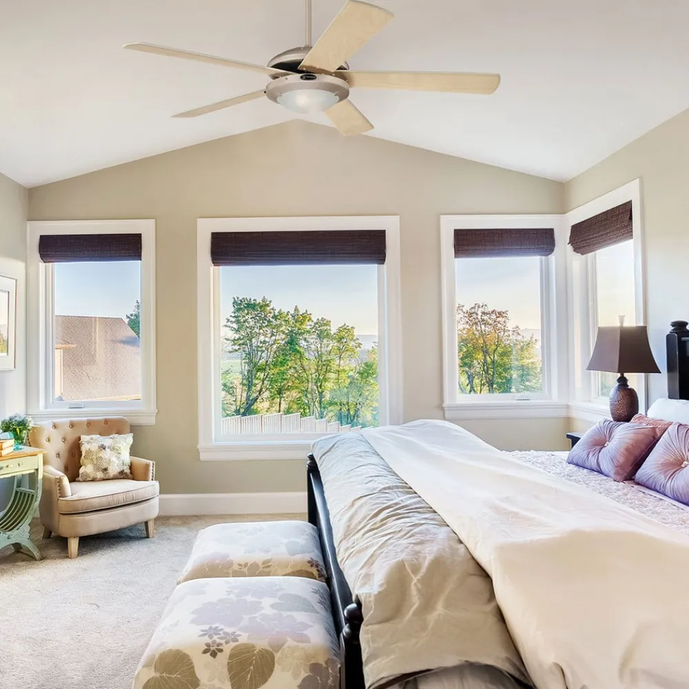 Loftventilatoren Comet imponerer med sin flade form og det titaniumfarvede metalhus. Den er udstyret med fem vendbare knive i hvidt eller ahornlook. I midten er der en opalhvid lysskærm til den integrerede ekstra belysning. Forlængerstænger, der anvendes ved loftshøjder på 350 cm eller mere, kan bestilles som tilbehør.