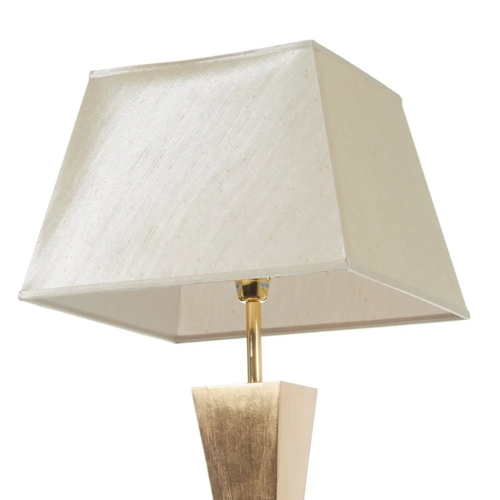 Fornem og rigt udsmykket virker gulvlampen Deco, som ikke bare gør indtryk med sin form og konstruktion, men også med kombinationen af materialerne, træ, metal og silke. På den kvadratiske fod af valnøddetræ er gulvlampens stel af metal med guldfoliefinish blevet anbragt. Det rager opad med sin kantede, snoede form og bærer den kantede, beigefarvede silkeskærm. Gulvlampen Deco er udstyret med en E27-fatning, hvor der er bare kan isættes traditionelle glødepærer op til 60 W, men også moderne LED-pærer eller energisparepærer.
