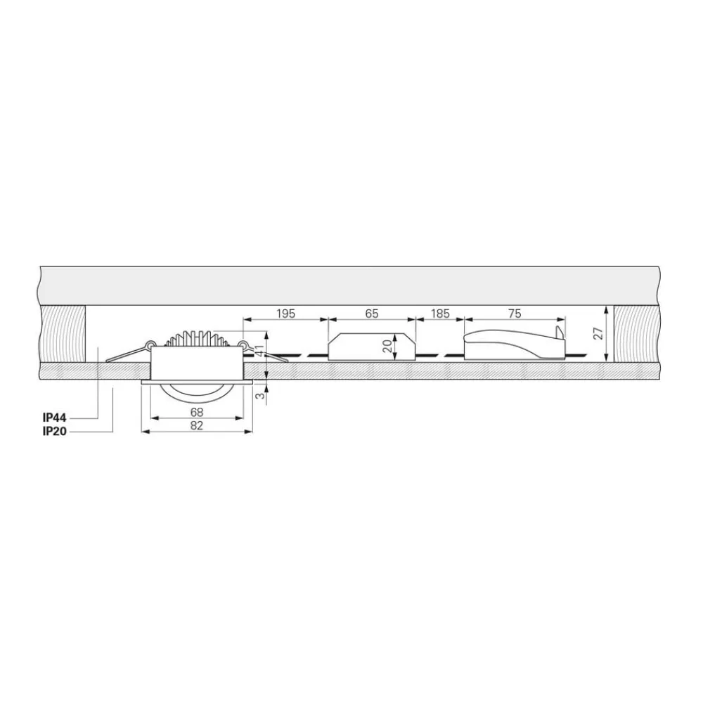 Drejelig indbygget loftlampe med LED Dione med IP44-beskyttelse Den indbyggede loftlampe med LED Dione imponerer med sin særligt lave installationsdybde. Det gør den meget pladsbesparende og kræver kun et hulrum i loftet på 25 mm. Tilslutningsboksen og den dæmpbare strømforsyning, der er inkluderet i leveringsomfanget, passer også ind i den 68 mm store udskæring takket være det kompakte design. Da alle komponenter er formonteret til brug, er der mulighed for tidsbesparende installation uden brug af værktøj. Tilslutningsboksen med plug-in-terminaler muliggør også 3-polet gennemfortrådning. Dette gør indbygningslampen til den ideelle løsning til eftermontering i et renoveringsprojekt eller til nye installationer med begrænset installationsplads. COB-teknologien af høj kvalitet gør det muligt for indbygningslampen at levere et højt, effektivt output. Huset er lavet af aluminium, strålevinklen er 36°, og lampehovedet kan vippes op til 30° – Armatur og strømforsyning med adapterstik – Stænktæt, IP44 – Mulighed for gennemfortrådning – Inkluderer dæmpbar strømforsyning og tilslutningsboks Tilslutningsboksen leveres med 2 skruer i forskellige længder, kort skrue ved brug af tynde kabler, lang skrue ved brug af NYM 3×1,5 installationskabler osv.
