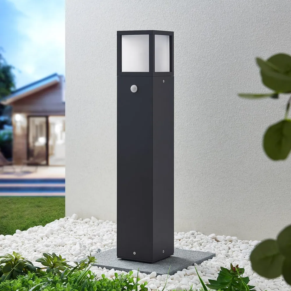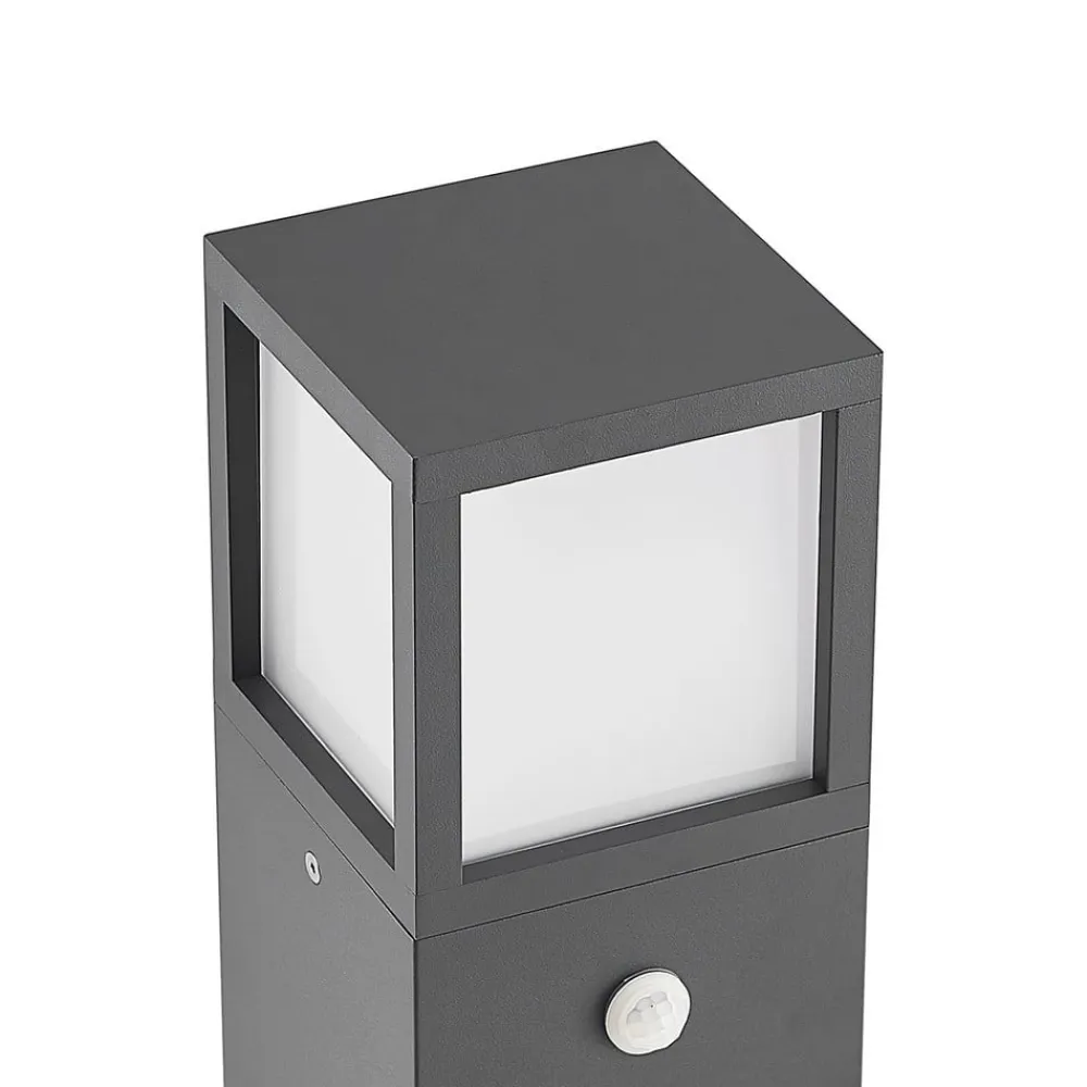 Dewari vejlampe med sensor i mørkegråt design Dewari vejlampen imponerer med sit kantede hus af trykstøbt aluminium med en mørkegrå overfladefinish. Den passer godt ind i forskellige miljøer og ser moderne og indbydende ud. Lampeskærmen er lavet af plast og udsender blændfrit lys til ydersiden. Takket være den gode kapslingsgrad og slagfasthed kan denne lampe også bruges udendørs i lang tid. Den integrerede bevægelsessensor er yderst praktisk og giver effektiv belysning, præcis når du har brug for det. Sensordata: – Rækkevidde op til 8 meter (justerbar) – Registreringsvinkel op til 100° – 10 til 2.000 lux (justerbar) – Lysets varighed kan justeres (5 s, 30 s, 1 min, 3 min, 5 min, 8 min)
