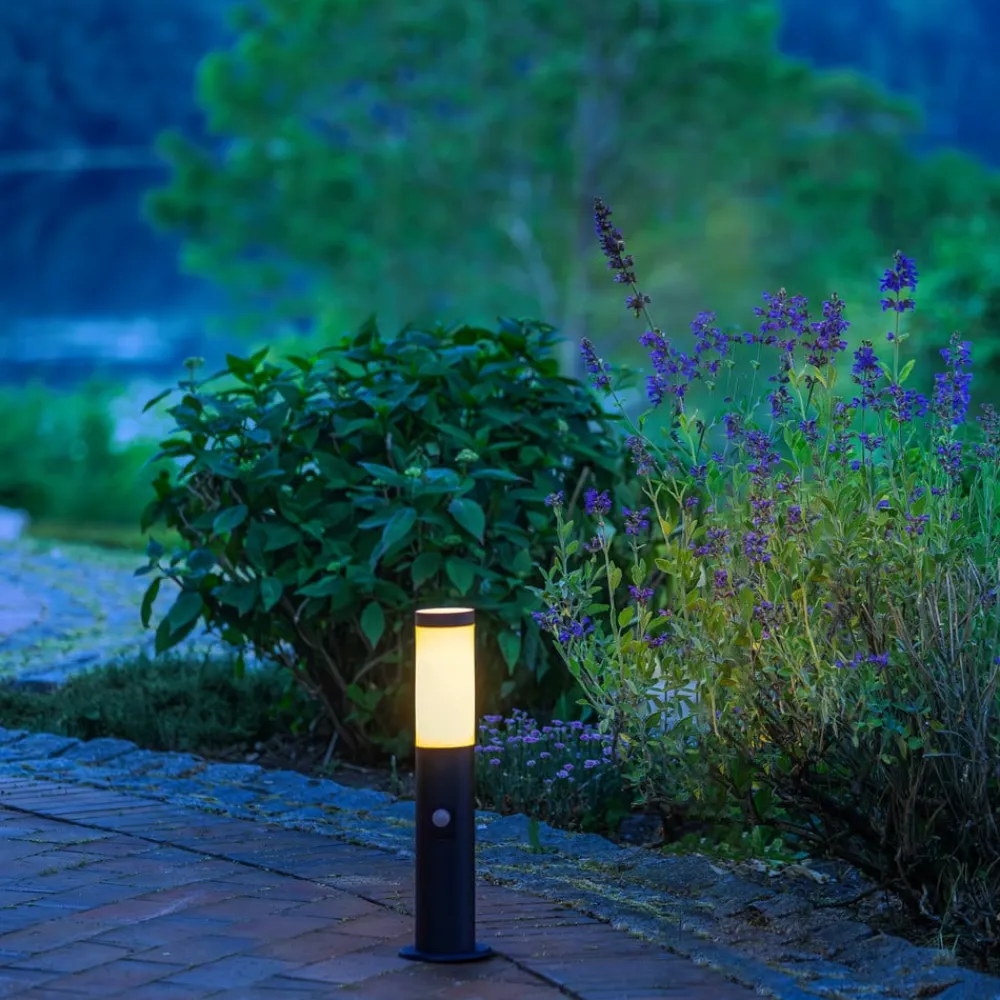 Dody sokkellampe i sort med bevægelsessensor Dody sokkellampen er lavet til sokler i haven og oplyser både indkørsler og terrasser. Lampen er fremstillet af rustfrit rustfrit stål og er udstyret med en plastdiffusor. Den integrerede E27-fatning kan monteres med LED-pærer (maks. 20 W). Den leveres inklusive monteringsmateriale – Bevægelsessensorens rækkevidde er maks. 8 meter – Lysets varighed kan justeres fra 10 til 300 sekunder – Justerbar responslysstyrke