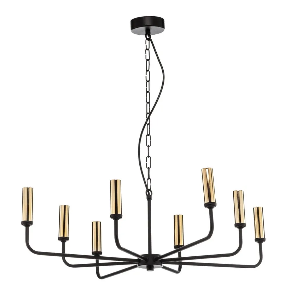 Lysekrone Ampli i sort og guld kombinerer moderne design med højkvalitets stål. Med sine otte lysarme sætter den stilfulde accenter i ethvert rum, hvad enten det er i stuen, køkkenet eller spisestuen. Kombinationen af sort og guldfinish giver lysekronen en tidløs elegance, der harmonerer med forskellige indretningsstilarter.