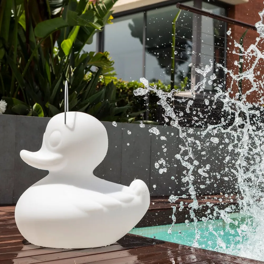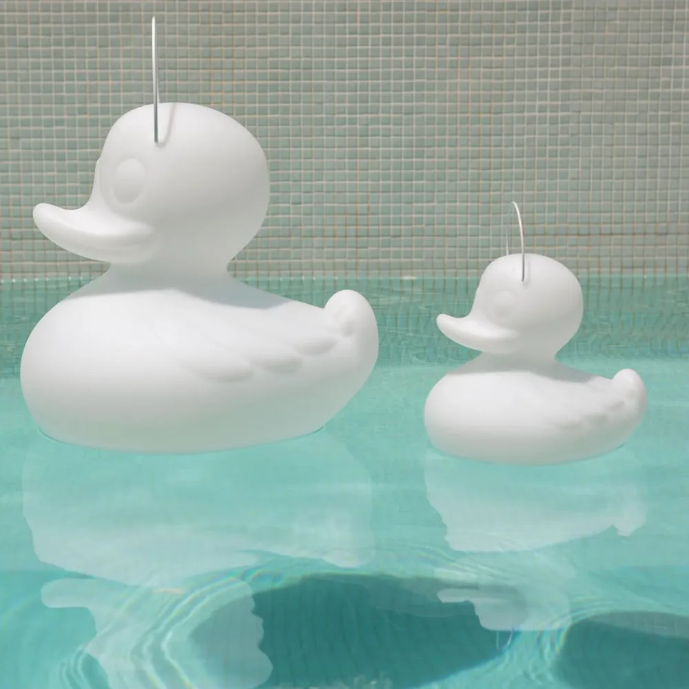 LED-designlampe DUCK-DUCK XL til udendørs brug – brudsikker, stødsikker og UV-resistent Badeanden i XL-størrelse er et produkt af den engelske designer Marke Newton for Goodnight Light. Den dekorative lampe DUCK DUCK XL er produceret i Spanien og garanterer førsteklasses kvalitet og et iøjnefaldende design. Lampen er lavet af UV-resistent plast, som også er brud- og stødsikkert. Anden kan flyde og er garanteret vejrbestandig. De indbyggede lysdioder kan nemt styres med en infrarød fjernbetjening. Et integreret genopladeligt batteri lader DUCK-DUCK skinne i omkring syv til ti timer med en opladningstid på omkring seks timer. Belysningstiden kan variere afhængigt af den valgte lysstyrkeindstilling (tre lysstyrkeniveauer er mulige). På trods af sin størrelse er DUCK-DUCK XL-dekoanden nem at transportere. Det er muligt takket være et praktisk bærehåndtag, der er fastgjort til andens hoved. Uanset om det er privat eller kommercielt, er DUCK-DUCK XL designlyset det perfekte tilbehør til haven, poolen og alle andre udendørs områder. Vigtige bemærkninger: – På grund af det farvede lysende legeme på nogle modeller vises lysfarverne ikke i deres oprindelige nuance I nogle farvenuancer kan der forekomme subtraktiv farveblanding, hvorved visse lysfarver filtreres gennem farven på det lysende legeme på en sådan måde, at det menneskelige øje ikke længere opfatter dem.