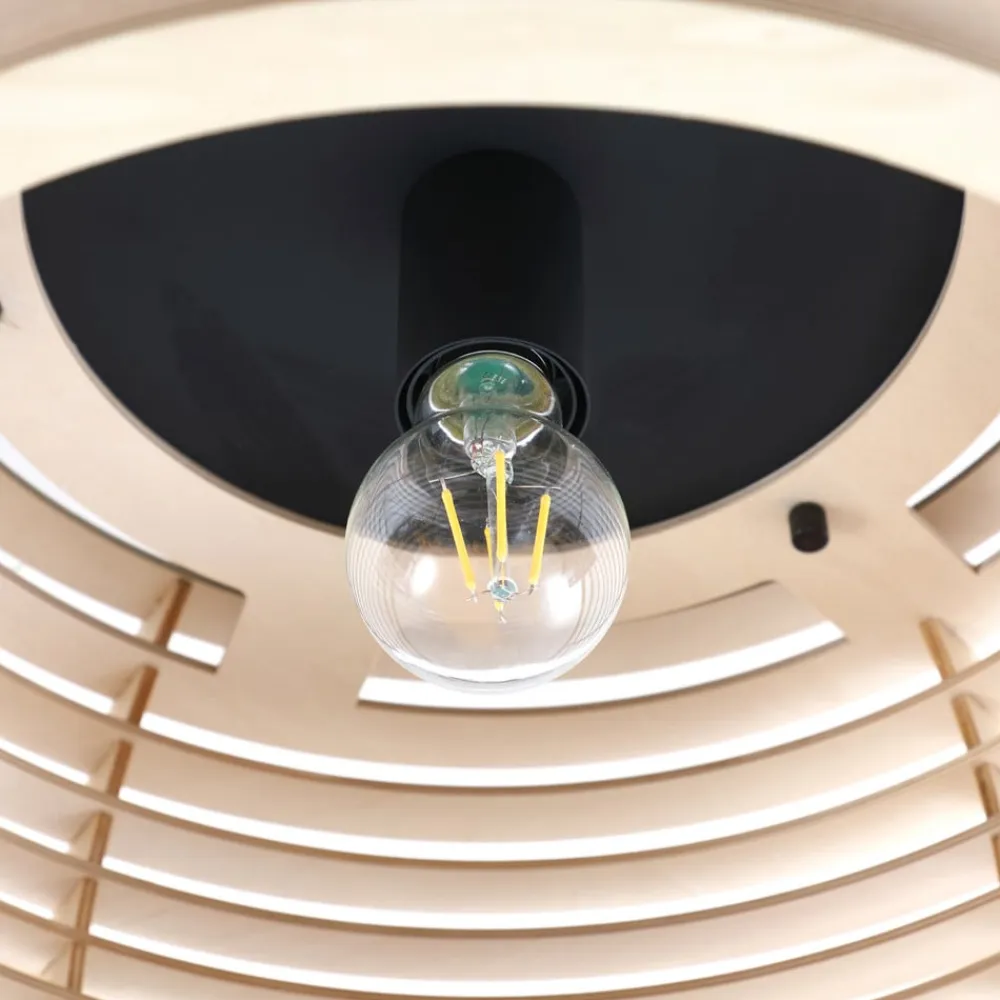 Rund Ediz loftlampe med flerlags træskærm Ediz loftlampen består af en baldakin i jern og en åben træskærm. Skærmens farvesammensætning giver omgivelserne et naturligt præg, som suppleres af baldakinen i moderne sort. Armaturets åbne design skaber en smuk lys- og skyggeeffekt i rummet, og lyset spotlightes nedad og sidelæns udad. En dekorativ lyskilde er særligt velegnet til belysning. Ediz kan bruges fleksibelt i boligområdet, for eksempel som lyskilde i stuen, gangen, soveværelset eller spisestuen.
