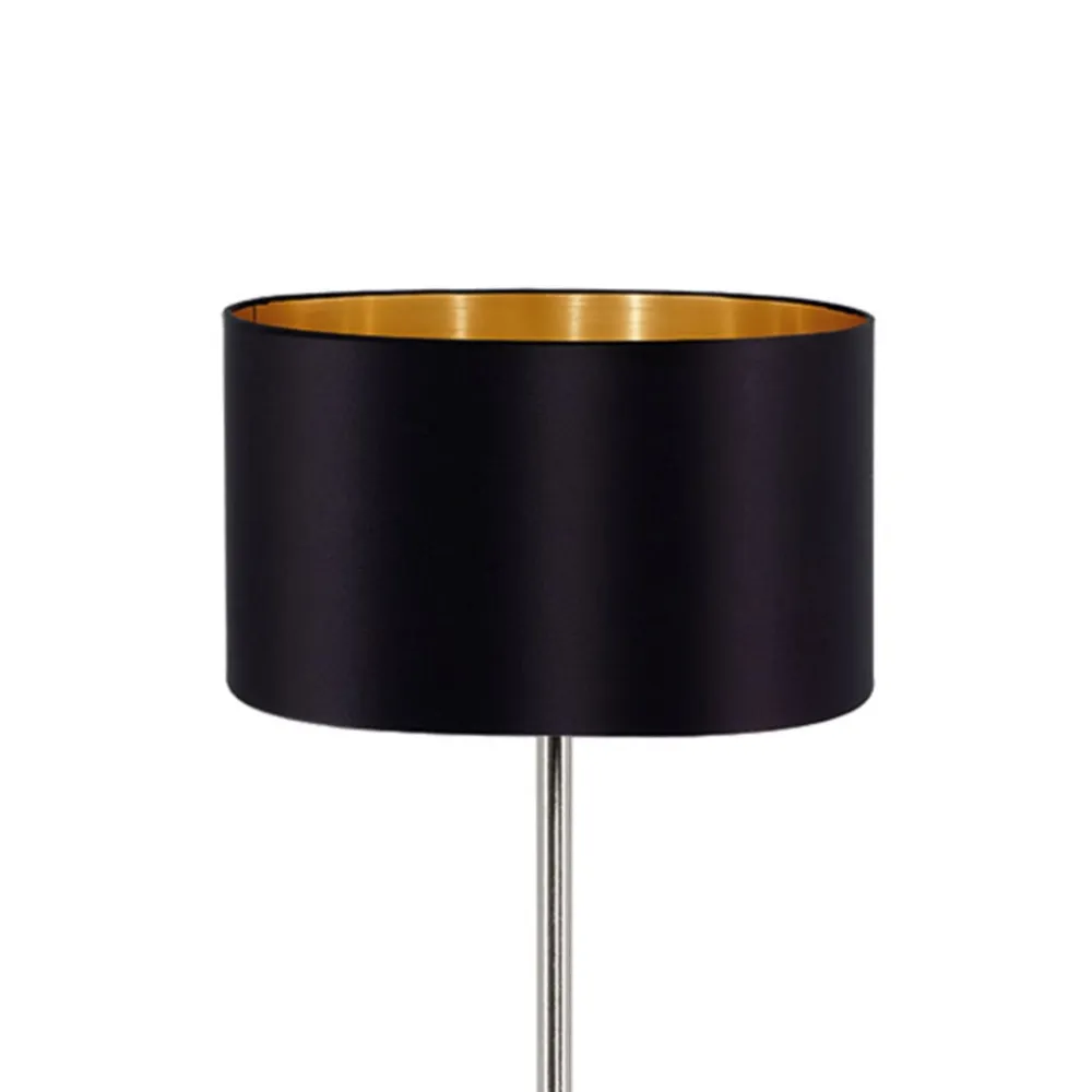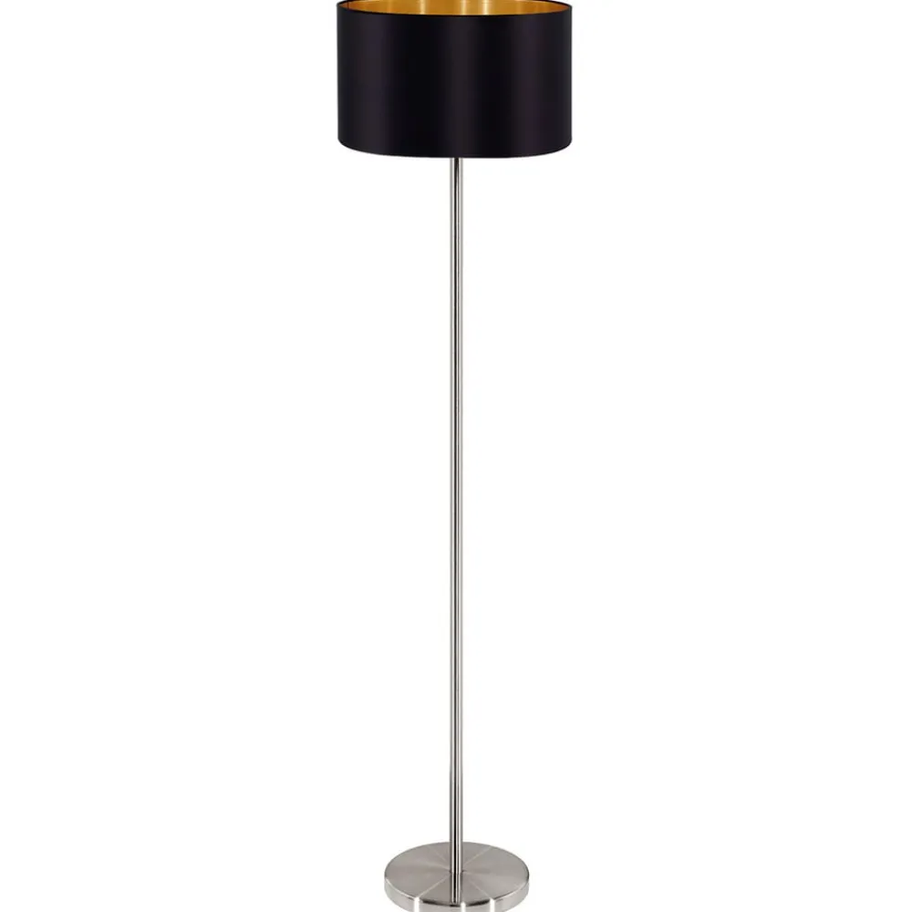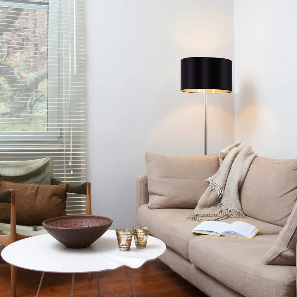 Maserlo er en ædel gulvlampe, der kan kombineres med en bred vifte af boligstilarter. Den har en elegant lampefod i mat nikkel, og en sort stofskærm, der indvendig er guldfarvet. Takket være den skinnende indvendige overflade, har lampen ikke kun et meget elegant udseende, men skaber også et særligt varmt lysskær, da lyset reflekteres vidunderligt gennem den guldfarvede indvendige overflade. Den praktiske trykkontakt på kablet, sikrer en nem betjening