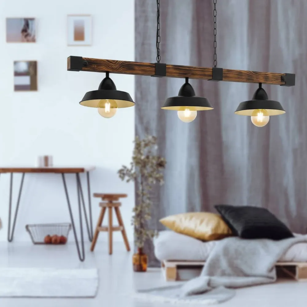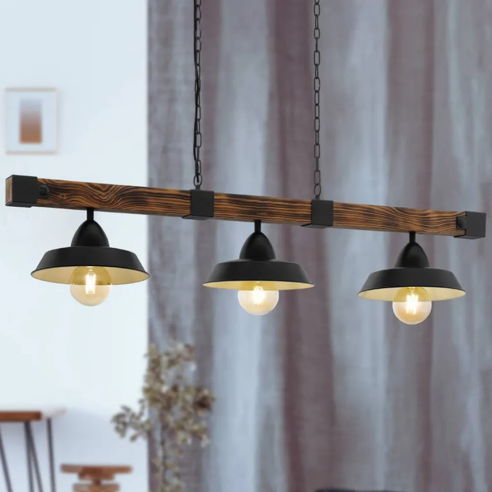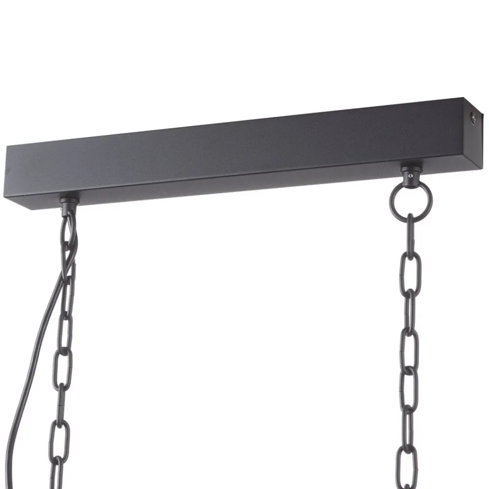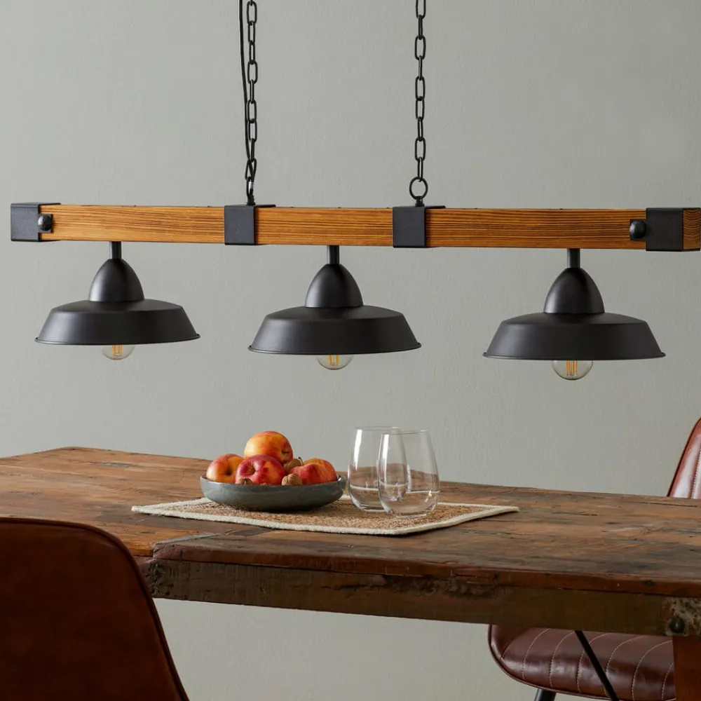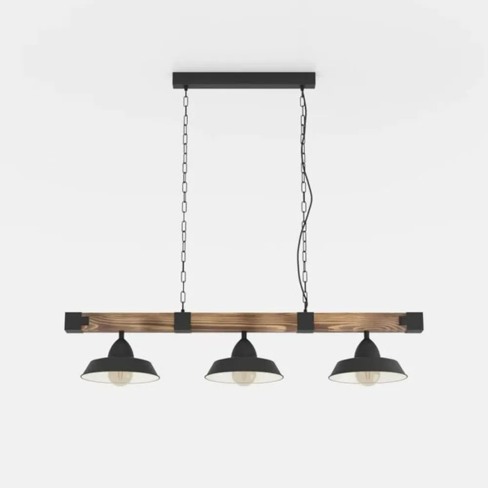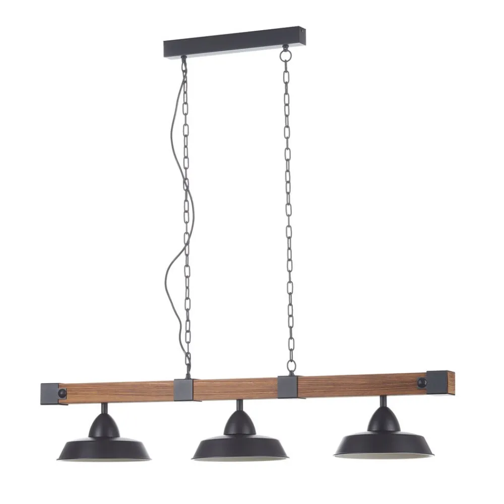 Pendellampen Oldbury er med sin rustikke stil, der leder tankerne hen på industritidsalderen, et ægte blikfang. To sorte kæder af stål er øverst forbundet med en liste, der kan skrues ind i loftet. Nedenunder svæver en aflang træbjælke i rummet, hvor der er fastgjort tre lampeskærme af stål.