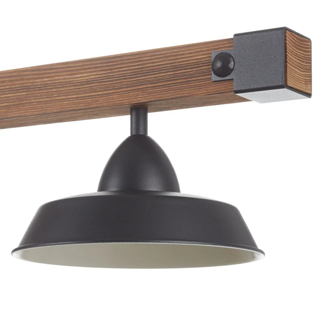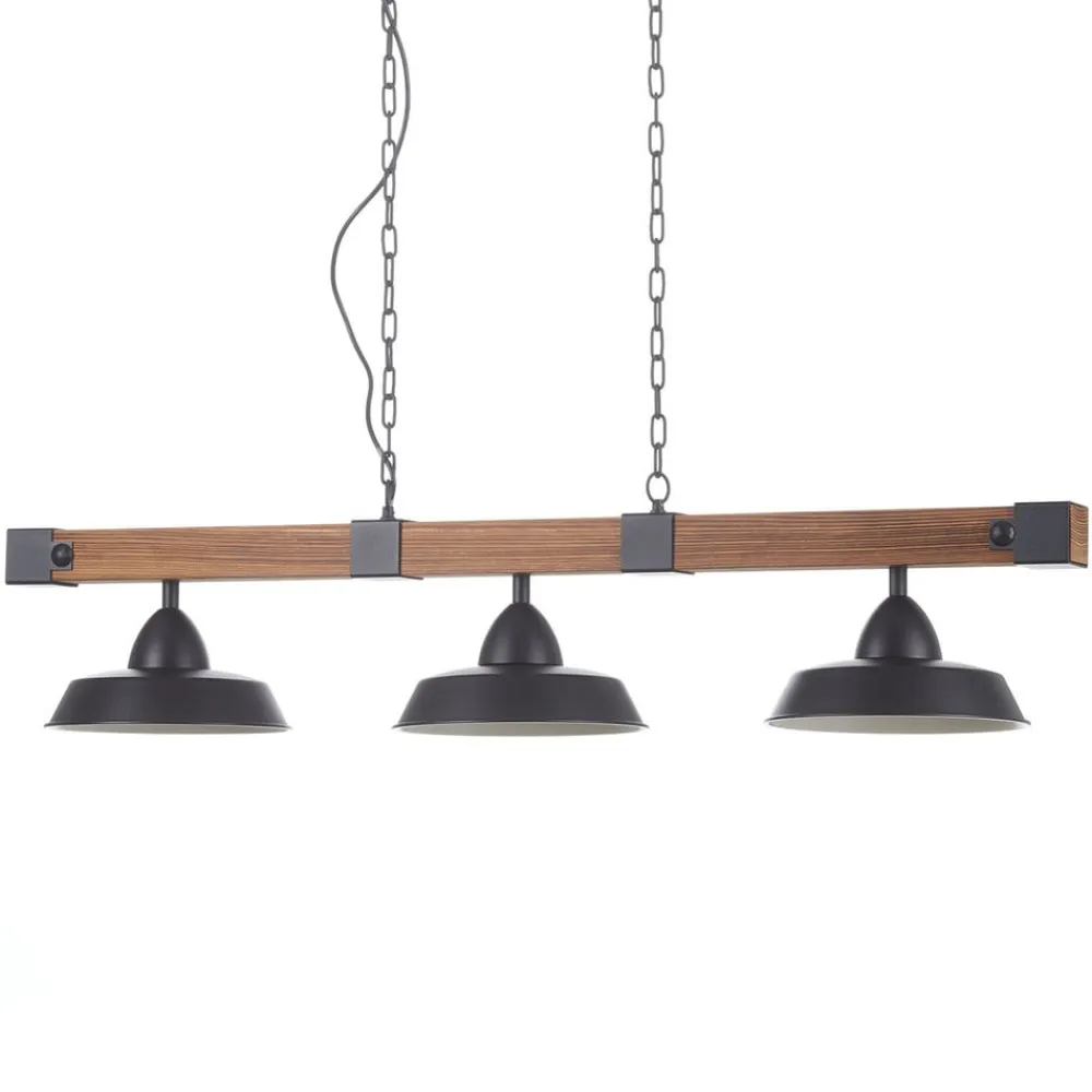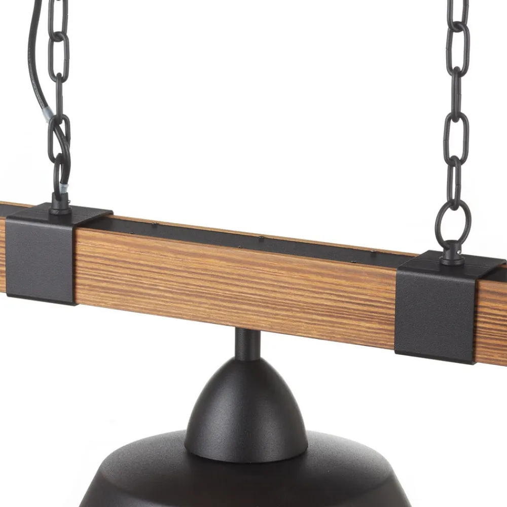 Træbjælken er udsmykket med fire stålelementer, der omslutter den. De tre skærme har en rund form, hvorfra pærerne (medfølger ikke) strækker sig nedad. Dermed skinner pendellampen ikke bare nedad, men også til siderne med et varmt lys. Det lyser bordet eller dagligstuegruppen rummeligt op – til at give et statement i daglig- eller spisestuen.