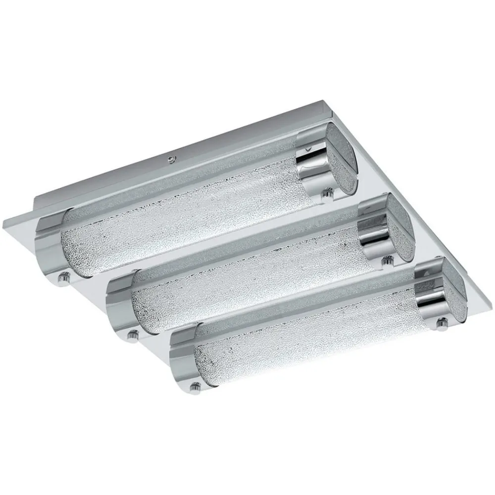 Tre halvcirkelformede rør af klart glas, der er designet med et funklende krystaludseende på indersiden, sidder i to forkromede holdere på hver sin side af den firkantede loftplade af rustfrit stål. Krompladen reflekterer de halvcirkulære rør, som er udstyret med universelle hvide LED’er indeni. Lyset skinner skarpt ind i rummet og får krystaloptikken i brillerne til at funkle. Med Tolorico LED-loftarmaturet kan der skabes en lys grundbelysning i mange rum, og da det er beskyttet mod stænkvand med beskyttelsesklasse IP44, kan det endda installeres på badeværelset.