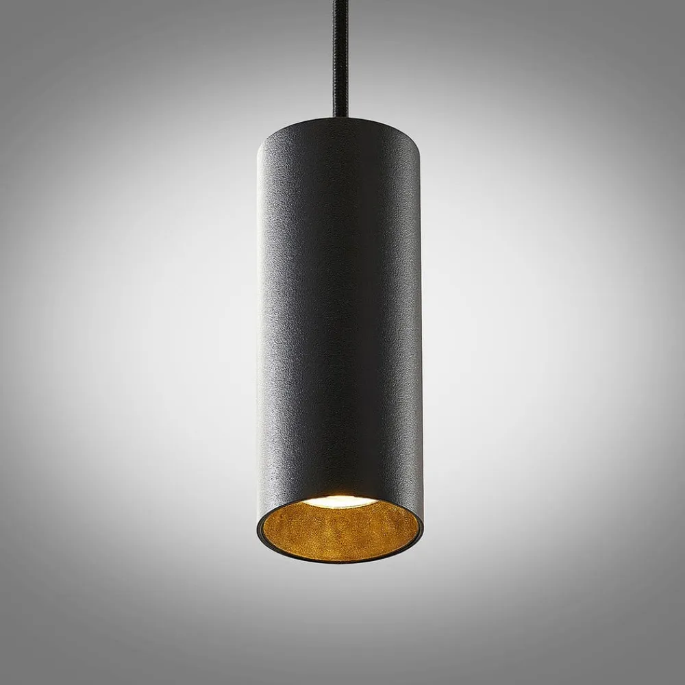 Smal Ejona pendellampe med sort finish og ekstra reflektorring i guld Ejona passer især godt til moderne interiør. Pendellampen er rund, smal og har en lampeskærm af uigennemsigtig aluminium, før den får en sort finish. Afhængigt af valget af GU10-pære, som også fås med effektiv LED-teknologi, er lyset spotformet og hovedsageligt rettet nedad. Især et bordområde kan blive godt oplyst på denne måde, især hvis flere af lamperne placeres ved siden af hinanden med en vis afstand. For et mere individuelt look og et lysmønster med varme refleksioner kan du bruge den ekstra reflektorpære, som også er inkluderet i leveringsomfanget, og som har en smuk gylden farve.