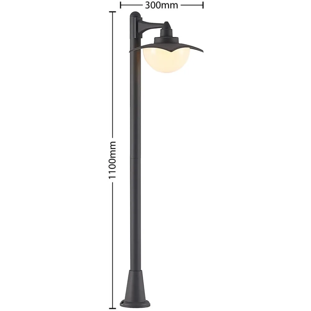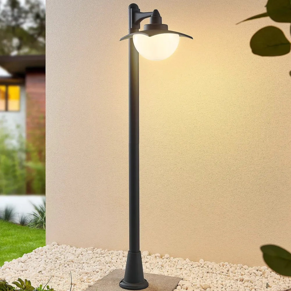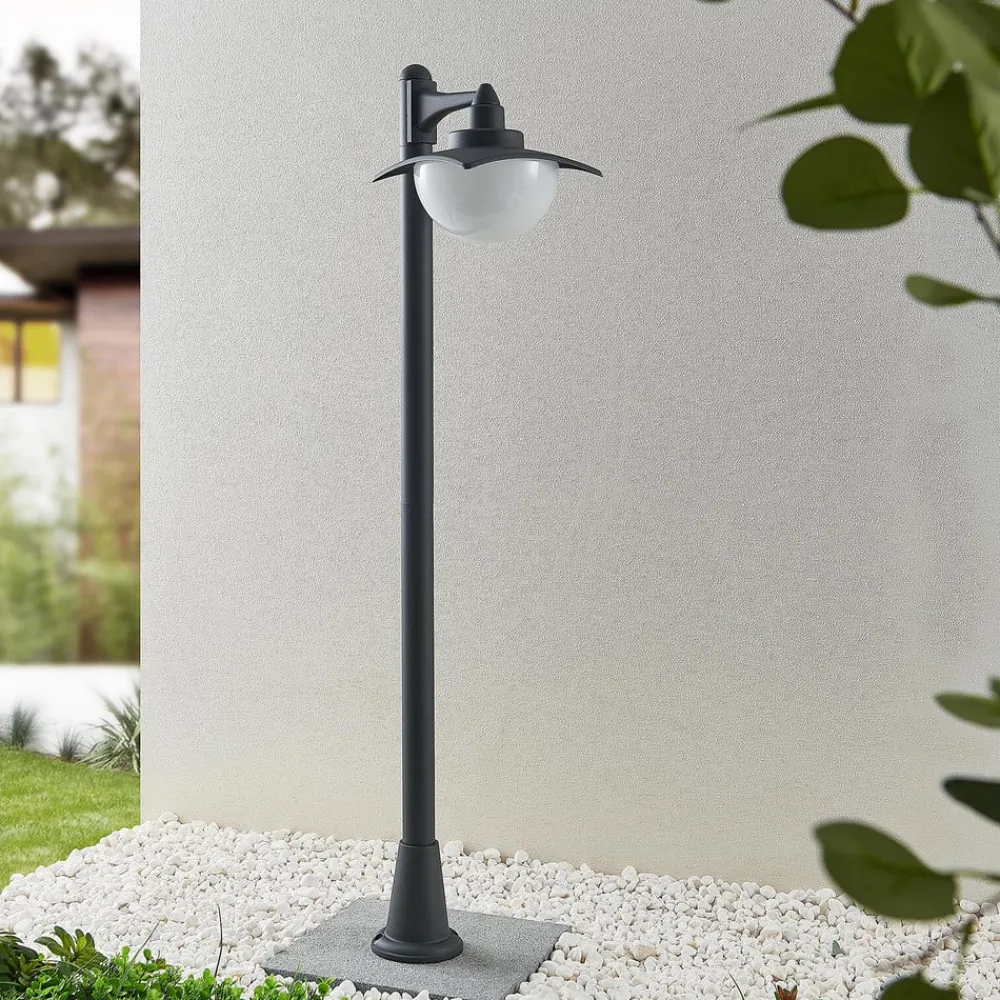Elinda vejlampe med 1 lyskilde og hvid glasskærm Elinda vejlampen er ideel til belysning af have- og terrassestier. Den er særlig effektiv, når den installeres i en række med flere armaturer på ejendommen. Lyset sendes nedad, og E27-pæren er beskyttet af en hvid lampeskærm. Den tjener også til at sprede lyset, så det fordeles blidt og jævnt. Kapslingsgraden på IP44 er ideel til permanent udendørs brug.