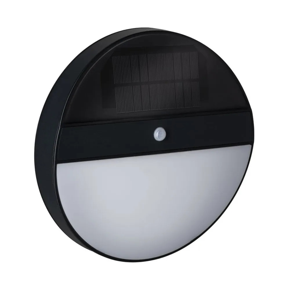 Den runde Elois-solcellelampe til vægmontering er udstyret med solcelleteknologi og kan derfor fungere uden strømforsyning. Om dagen oplades det integrerede batteri, og ved skumring lyser et lille orienteringslys konstant. Takket være den integrerede bevægelsessensor ændres lysets intensitet, når der registreres bevægelse, og lyset skifter til et klart funktionslys. Meget praktisk til udendørsområder, der er meget trafikerede og skal være tilstrækkeligt oplyste af sikkerhedsmæssige årsager.