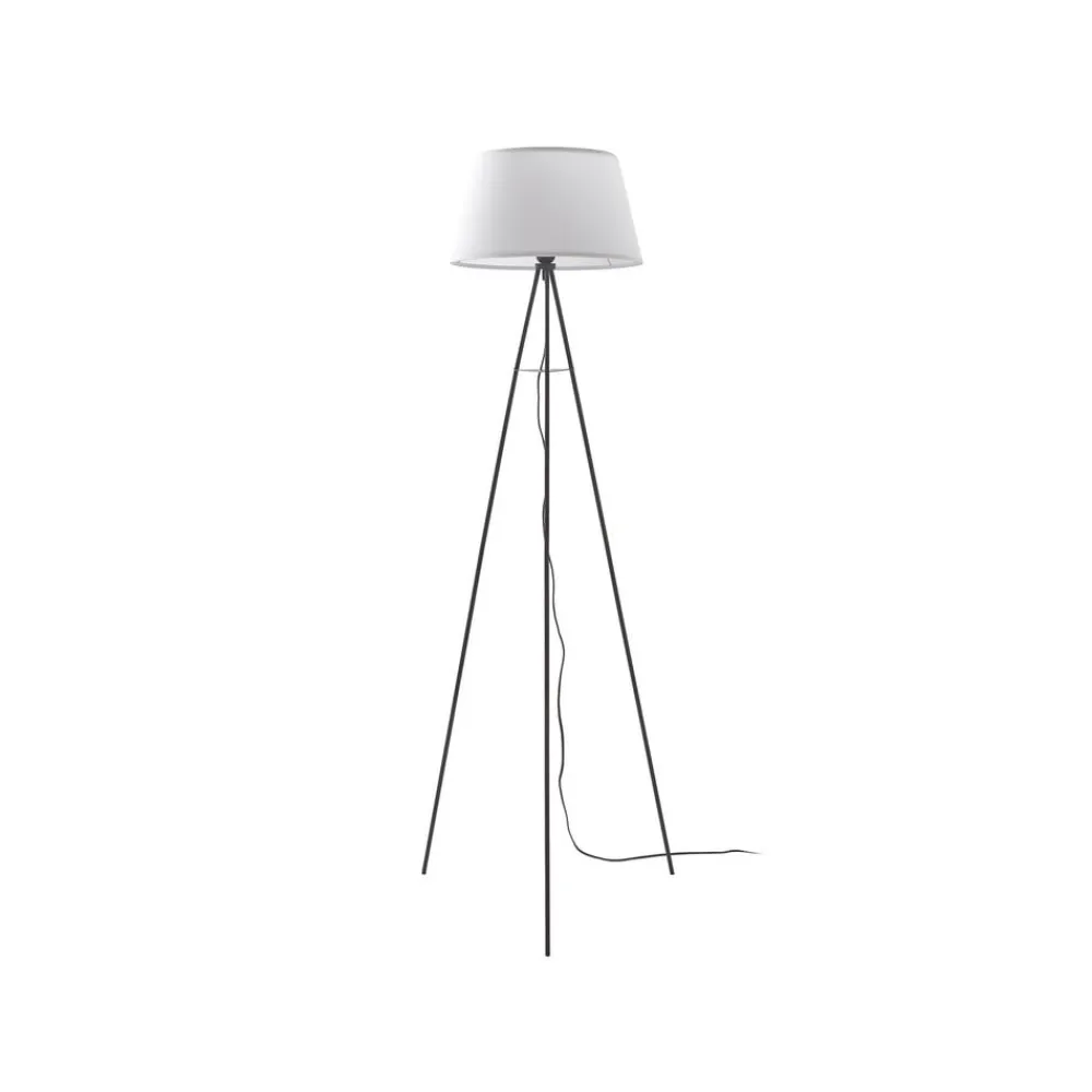 Elegant gulvlampe Elsika i stof med hvid skærm og lille hylde Elsika er en smuk lyskilde til opholds- og soveområder. Lampeskærmen er lavet af hvidt stof, har en rund form og udvider sig lidt mod bunden. Lyset trænger blødt, jævnt og hyggeligt ind i rummet, så du kan føle dig helt tryg og slappe af, når du lader aftenen ebbe ud i skæret fra Elsika, når den er tændt som accentbelysning. Derudover har gulvlampen et filigran stativ, som er sort og lavet af metal. Der er en lille, men attraktiv trekantet hylde i den øverste del, som er velegnet til opbevaring af småting som f.eks. en mobiltelefon. Lampen betjenes ved hjælp af en fodkontakt i forsyningskablet.