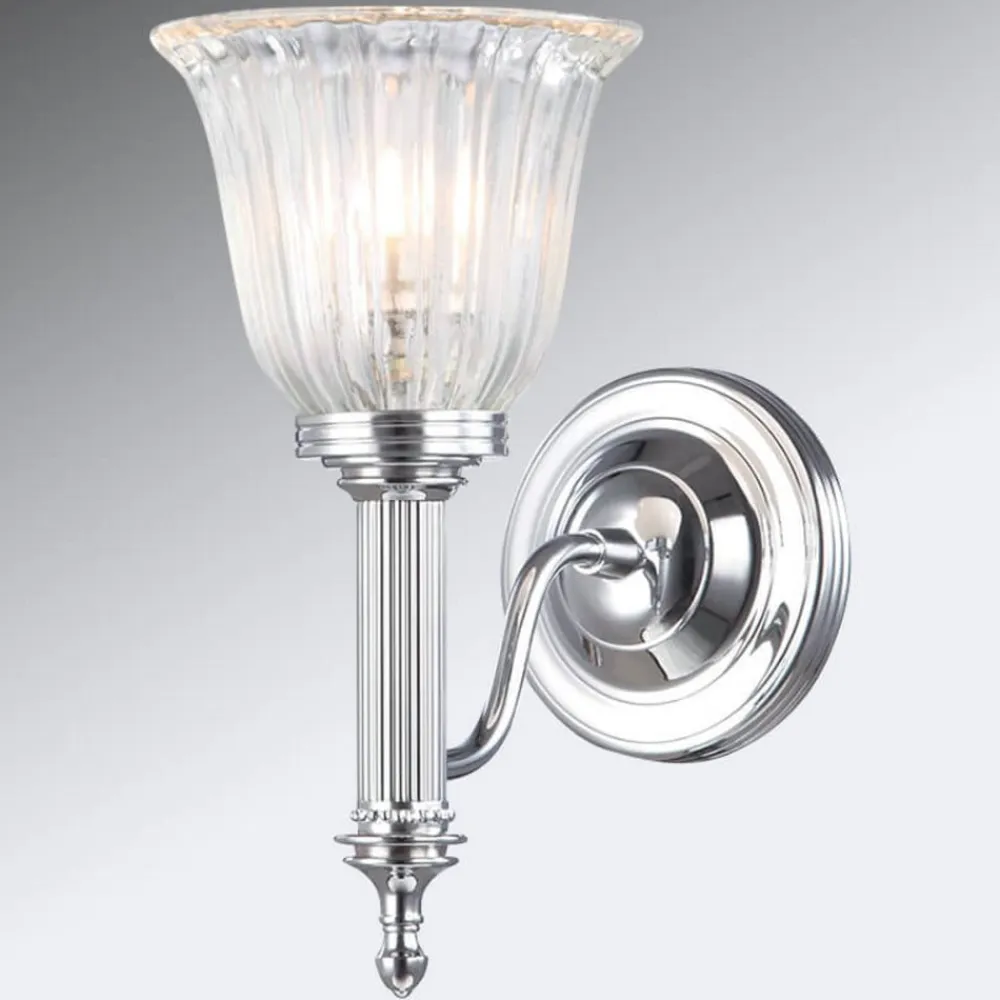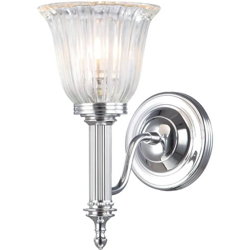 Solid håndværk lavet af messing karakteriserer den æstetisk designede fugtisolerede væglampe Carroll. Vægmontering og lampearm var briljant krom, det gennemsigtige glas er forsynet med en fin rillestruktur, der giver en særlig glød af lysemissionen.